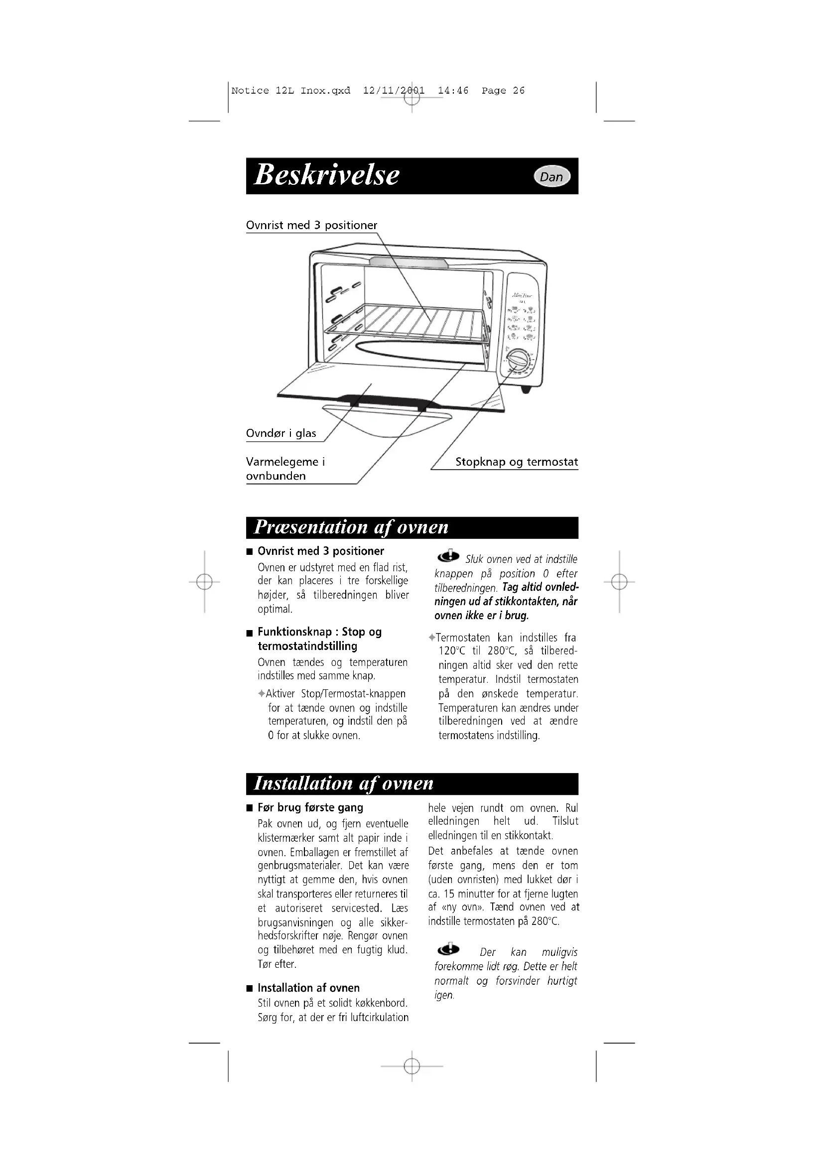 Installation af ovnen Stil ovnen på et solidt køkkenbord. Sørg for, at der er fri luftcirkulation hele vejen rundt om ovnen. Rul elledningen helt ud. Tilslut elledningen til en stikkontakt. Det anbefales at tænde ovnen første gang, mens den er tom (uden ovnristen) med lukket dør i ca. 15 minutter for at fjerne lugten af «ny ovn». Tænd ovnen ved at indstille termostaten på 280°C. Der kan muligvis forekomme lidt røg. Dette er helt normalt og forsvinder hurtigt igen. Varmelegeme i ovnbunden Stopknap og termostat Ovndør i glas Ovnrist med 3 positioner Dan Notice 12L Inox.qxd 12/11/2001 14:46 Page 26Rengøring af ovnen
