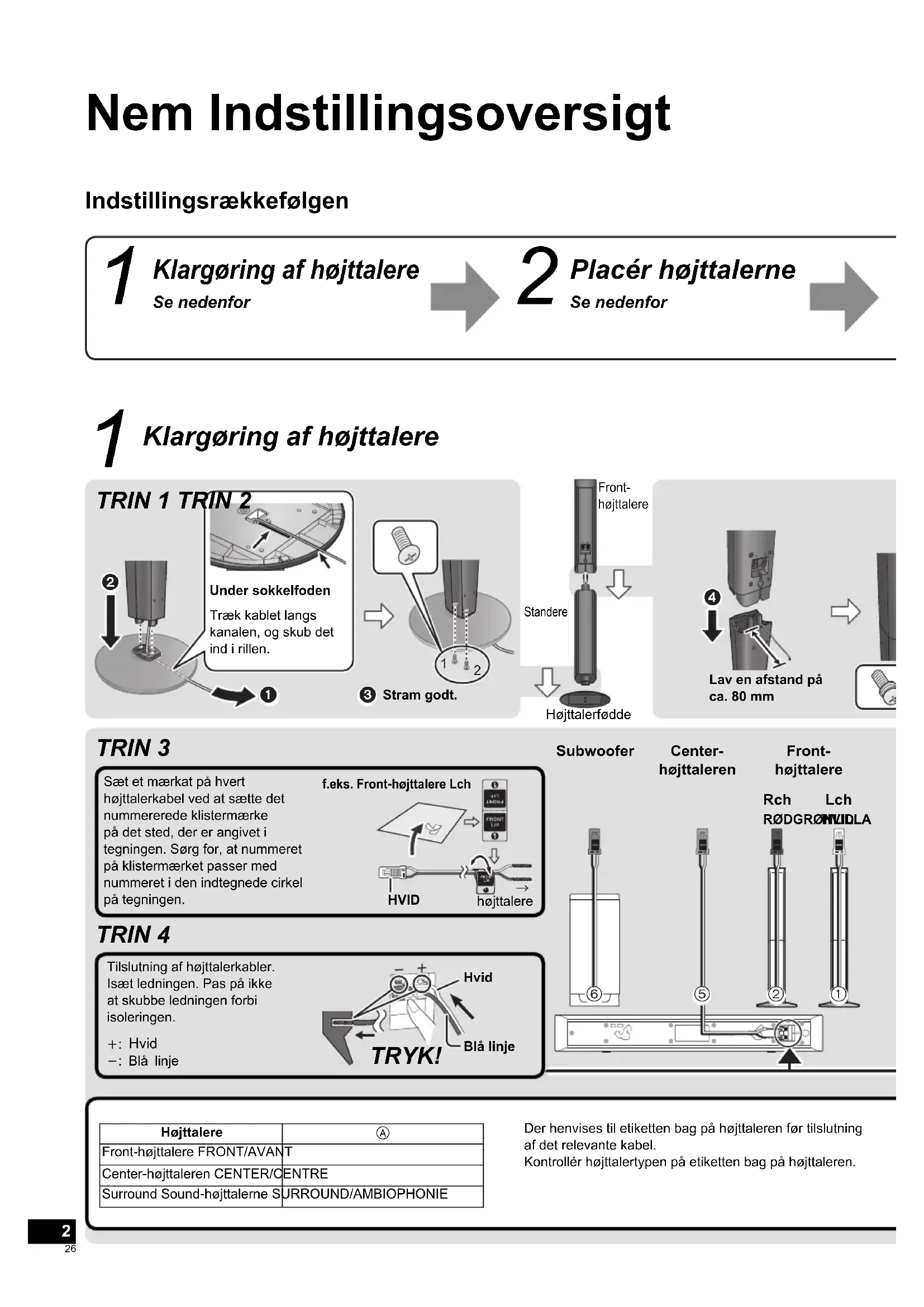 Nem Indstillingsoversigt Indstillingsrækkefølgen Klargøring af højttalere Se nedenfor Placér højttalerne Se nedenfor Klargøring af højttalere Der henvises til etiketten bag på højttaleren før tilslutning af det relevante kabel.Kontrollér højttalertypen på etiketten bag på højttaleren.Højttalere Front-højttalere FRONT/AVANTCenter-højttaleren CENTER/CENTRESurround Sound-højttalerne SURROUND/AMBIOPHONIESæt et mærkat på hvert højttalerkabel ved at sætte det nummererede klistermærke på det sted, der er angivet i tegningen. Sørg for, at nummeret på klistermærket passer med nummeret i den indtegnede cirkel på tegningen.Tilslutning af højttalerkabler.Isæt ledningen. Pas på ikke at skubbe ledningen forbi isoleringen.: Hvid : Blå linjef.eks. Front-højttalere Lch TRYK! Front- højttalere Center- højttaleren Subwoofer TRIN 3 TRIN 4 TRIN 1 TRIN 2 HVID Hvid Blå linjeStram godt.Lav en afstand på ca. 80 mmStandereHøjttalerføddehøjttalere Lch HVID Rch RØDGRØNLILLAFront-højttalereUnder sokkelfodenTræk kablet langs kanalen, og skub det ind i rillen. SCBTT770EG-VQC8274.indb26SCBTT770EG-VQC8274.indb26 2011/01/1411:25:152011/01/1411:25:1527