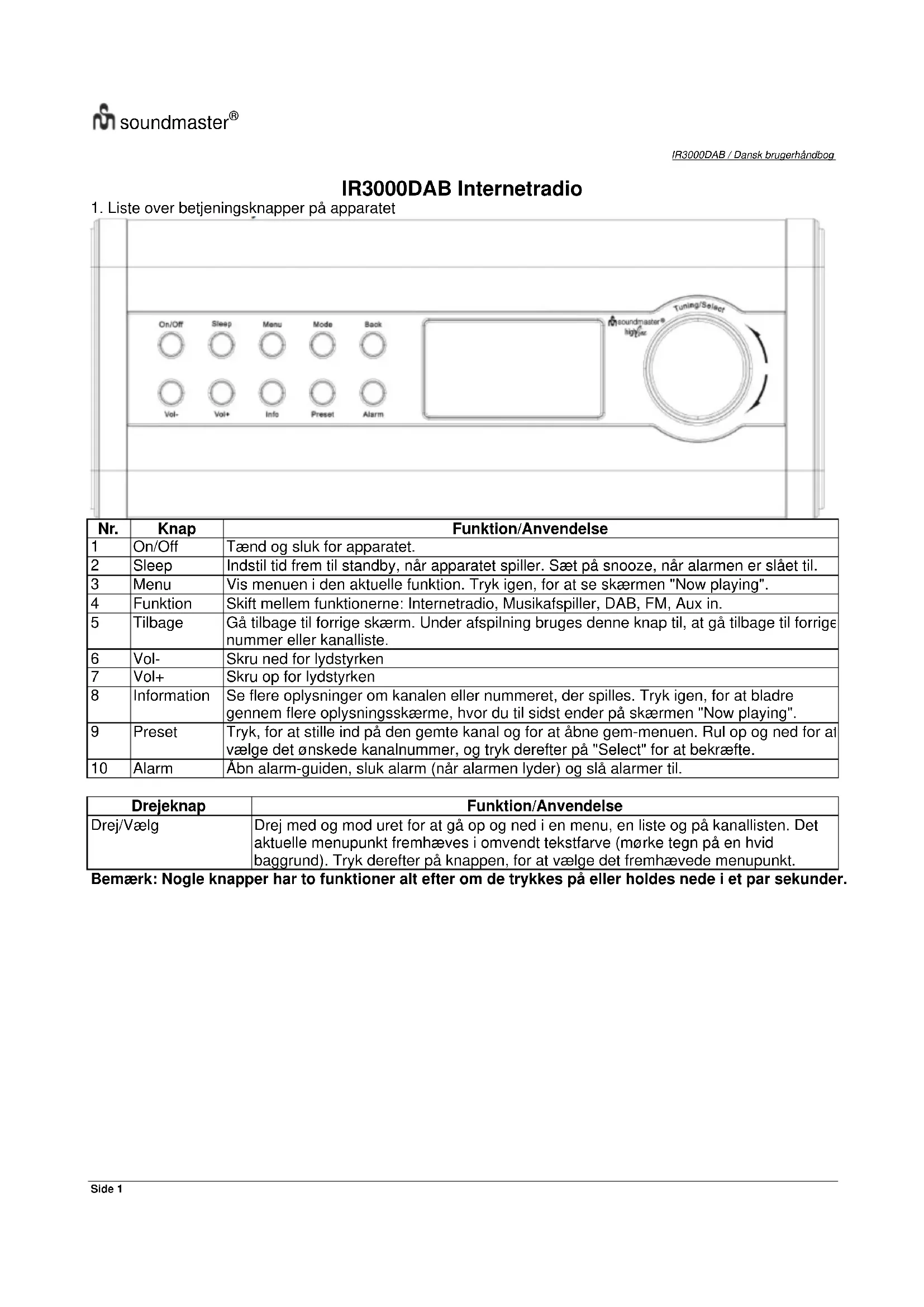 Download vejledningen til din Radio i PDF-format gratis! Find din vejledning IR3000DAB - Soundmaster og tag din elektroniske enhed tilbage i hånden. På denne side er alle dokumenter nødvendige for brugen af din enhed offentliggjort. IR3000DAB af mærket Soundmaster.