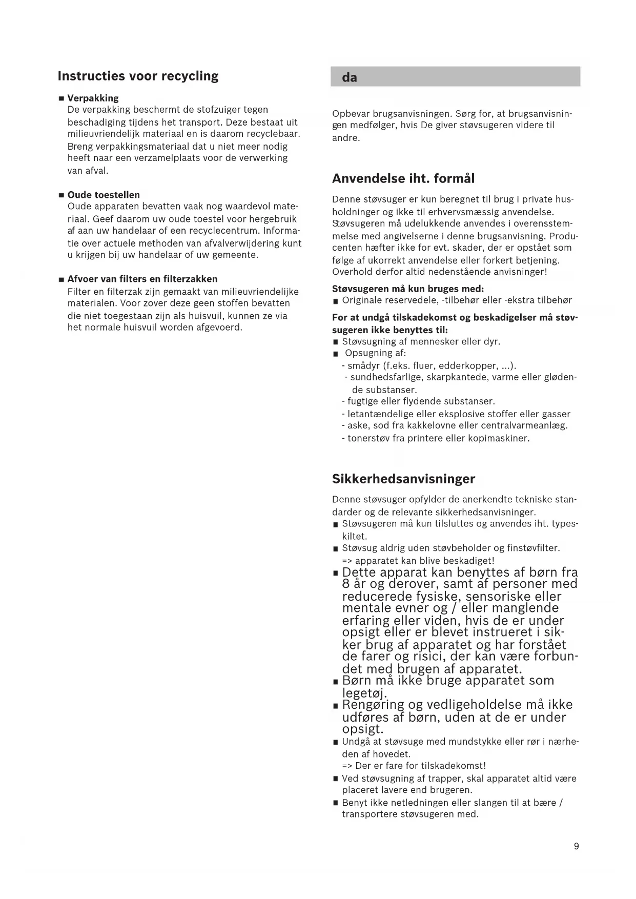 en medfølger, hvis De giver støvsugeren videre til andre. Anvendelse iht. formål Denne støvsuger er kun beregnet til brug i private hus- holdninger og ikke til erhvervsmæssig anvendelse.