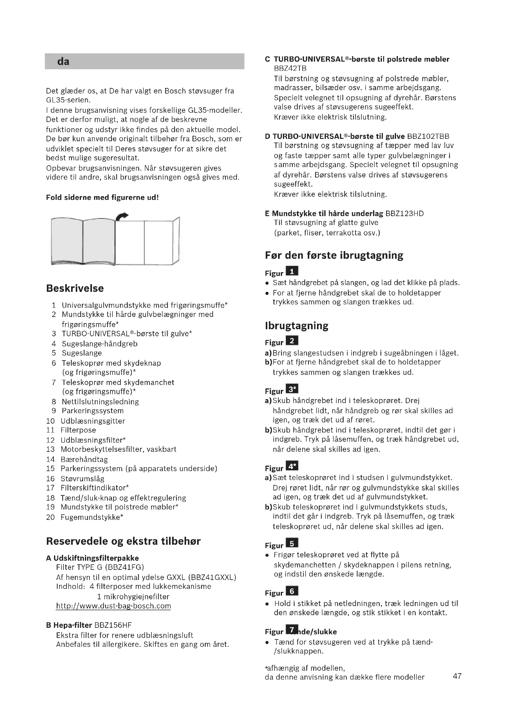 L35-serien. I denne brugsanvisning vises forskellige GL35-modeller. Det er derfor muligt, at nogle af de beskrevne funktioner og udstyr ikke findes på den aktuelle model. De bør kun anvende originalt tilbehør fra Bosch, som er udviklet specielt til Deres støvsuger for at sikre det bedst mulige sugeresultat. Opbevar brugsanvisningen. Når støvsugeren gives videre til andre, skal brugsanvisningen også gives med. Fold siderne med figurerne ud! Beskrivelse 1 Universalgulvmundstykke med frigøringsmuffe* 2 Mundstykke til hårde gulvbelægninger med frigøringsmuffe* 3 TURBO-UNIVERSAL®-børste til gulve* 4 Sugeslange-håndgreb 5 Sugeslange 6 Teleskoprør med skydeknap (og frigøringsmuffe)* 7 Teleskoprør med skydemanchet (og frigøringsmuffe)* 8 Nettilslutningsledning 9 Parkeringssystem 10 Udblæsningsgitter 11 Filterpose 12 Udblæsningsfilter* 13 Motorbeskyttelsesfilter, vaskbart 14 Bærehåndtag 15 Parkeringssystem (på apparatets underside) 16 Støvrumslåg 17 Filterskiftindikator* 18 Tænd/sluk-knap og effektregulering 19 Mundstykke til polstrede møbler* 20 Fugemundstykke* Reservedele og ekstra tilbehør A Udskiftningsfilterpakke Filter TYPE G (BBZ41FG) Af hensyn til en optimal ydelse GXXL (BBZ41GXXL) Indhold: 4 filterposer med lukkemekanisme 1 mikrohygiejnefilter http://www.dust-bag-bosch.com B Hepa-filter BBZ156HF Ekstra filter for renere udblæsningsluft Anbefales til allergikere. Skiftes en gang om året.