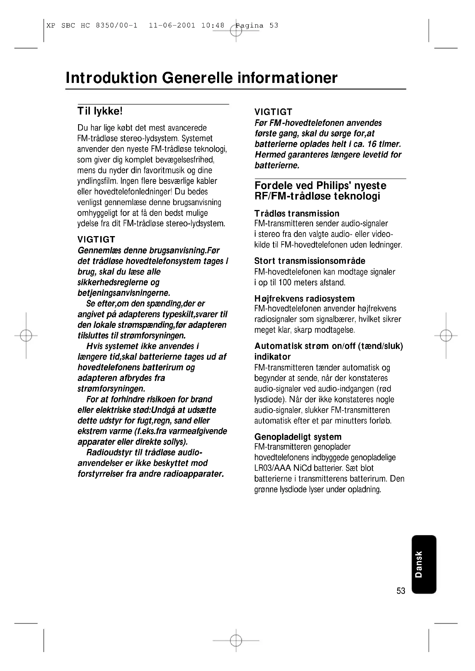 XP SBC HC 8350/00-1 11-06-2001 10:48 Pagina 5253 Dansk Til lykke! Du har lige købt det mest avancerede FM-trådløse stereo-lydsystem. Systemet anvender den nyeste FM-trådløse teknologi, som giver dig komplet bevægelsesfrihed, mens du nyder din favoritmusik og dine yndlingsfilm. Ingen flere besværlige kabler eller hovedtelefonledninger! Du bedes venligst gennemlæse denne brugsanvisning omhyggeligt for at få den bedst mulige ydelse fra dit FM-trådløse stereo-lydsystem. VIGTIGT Gennemlæs denne brugsanvisning.Før det trådløse hovedtelefonsystem tages i brug, skal du læse alle sikkerhedsreglerne og betjeningsanvisningerne. Se efter,om den spænding,der er angivet på adapterens typeskilt,svarer til den lokale strømspænding,før adapteren tilsluttes til strømforsyningen. Hvis systemet ikke anvendes i længere tid,skal batterierne tages ud af hovedtelefonens batterirum og adapteren afbrydes fra strømforsyningen. For at forhindre risikoen for brand eller elektriske stød:Undgå at udsætte dette udstyr for fugt,regn, sand eller ekstrem varme (f.eks.fra varmeafgivende apparater eller direkte sollys). Radioudstyr til trådløse audio- anvendelser er ikke beskyttet mod forstyrrelser fra andre radioapparater. VIGTIGT Før FM-hovedtelefonen anvendes første gang, skal du sørge for,at batterierne oplades helt i ca. 16 timer. Hermed garanteres længere levetid for batterierne. Fordele ved Philips' nyeste RF/FM-trådløse teknologi Trådløs transmission FM-transmitteren sender audio-signaler i stereo fra den valgte audio- eller video- kilde til FM-hovedtelefonen uden ledninger. Stort transmissionsområde FM-hovedtelefonen kan modtage signaler i op til 100 meters afstand. Højfrekvens radiosystem FM-hovedtelefonen anvender højfrekvens radiosignaler som signalbærer, hvilket sikrer meget klar, skarp modtagelse. Automatisk strøm on/off (tænd/sluk) indikator FM-transmitteren tænder automatisk og begynder at sende, når der konstateres audio-signaler ved audio-indgangen (rød lysdiode). Når der ikke konstateres nogle audio-signaler, slukker FM-transmitteren automatisk efter et par minutters forløb. Genopladeligt system FM-transmitteren genoplader hovedtelefonens indbyggede genopladelige LR03/AAA NiCd batterier. Sæt blot batterierne i transmitterens batterirum. Den grønne lysdiode lyser under opladning. Introduktion Generelle informationer XP SBC HC 8350/00-1 11-06-2001 10:48 Pagina 53Let transmission FM-hovedtelefonen kan modtage signaler fra transmitteren, selv igennem hindringer som f.eks døre, vægge og vinduer. Flere hovedtelefoner med én transmitter Et ekstra antal hovedtelefoner og/eller trådløse højttalere kan anvendes med en enkelt transmitter, hvis de: - virker inden for 864 MHz bølgelængden - kan konstatere en 19 kHz pilottone. Man kan se, om apparatet er kompatibelt ved at henvise til dets elektriske specifikationer. Sættet indeholder Dette FM-hovedtelefonsystem består af følgende tilbehør: 1 x SBC HC8352 FM-transmitter 1 x SBC HC8355 FM-hovedtelefon 1 x SBC CS030/00 12 volt/200 mA AC/DC-adapter 2 x genopladelige batterier LR03/AAA (NiCd), 550 mAh 1 x stik til 6,3 mm stereo-adapterstik 1 x antennerør Transmitter (figur 1) 1 Genopladningsindikator – den grønne lysdiode lyser under genopladning. Fuldstændig opbrugte batterier vil være helt opladede efter ca. 16 timer forløb. 2 Strømindikator – lyser, når der konstateres audio-signaler ved audio- indgangen. 3 Genopladningsrum – sæt blot batterierne i transmitterens batterirum. Den grønne lysdiode lyser under genopladning. 4 DC-strøm – tilsluttes 12 volt/200 mA AC/DC-adapteren 5 3,5 mm stereo-hovedtelefonens audio-indgang – forbinder FM-transmitteren med en audio-kilde 6 Kanalskifter – vælg en af 2 kanaler for at få den bedst mulige modtagelse.Vi råder dig til at vælge kanal 1 som første mulighed. 7 Betjeningsplade Hovedtelefon (figur 2) 8 Strømindikator – lyser, når apparatet er i brug. 9 Strøm tænd/sluk – sæt kontakten på tænd eller sluk for at tænde og slukke for hovedtelefonen. 10 Batterirum – fjern ørepolstringerne, tag batterierne ud og sæt dem i transmitterens genopladningsrum for genopladning. 11 Lydstyrke – indstil lydstyrken på det ønskede niveau. 12 Indstilling – drej indstillingshjulet, indtil signalet er klarest. Generelle informationer Betjeningsanordninger Dansk