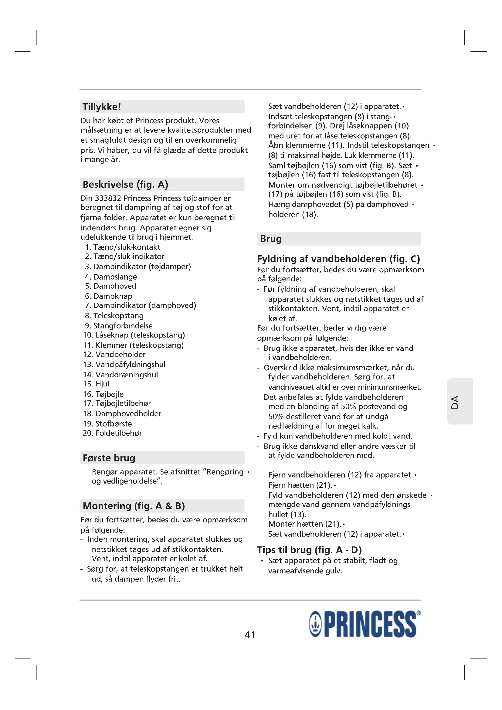 Tillykke! Du har købt et Princess produkt. Vores målsætning er at levere kvalitetsprodukter med et smagfuldt design og til en overkommelig pris. Vi håber, du vil få glæde af dette produkt i mange år. Beskrivelse (fig. A) Din 333832 Princess Princess tøjdamper er beregnet til dampning af tøj og stof for at fjerne folder. Apparatet er kun beregnet til indendørs brug. Apparatet egner sig udelukkende til brug i hjemmet.