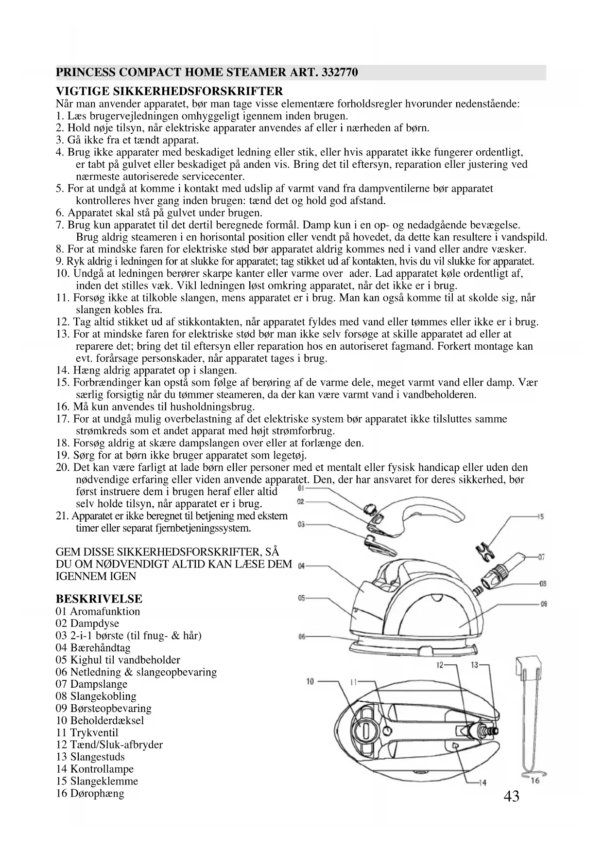 DU OM NØDVENDIGT ALTID KAN LÆSE DEM IGENNEM IGEN BESKRIVELSE 01 Aromafunktion 02 Dampdyse 03 2-i-1 børste (til fnug- & hår) 04 Bærehåndtag 05 Kighul til vandbeholder 06 Netledning & slangeopbevaring 07 Dampslange 08 Slangekobling 09 Børsteopbevaring 10 Beholderdæksel 11 Trykventil 12 Tænd/Sluk-afbryder 13 Slangestuds 14 Kontrollampe 15 Slangeklemme 16 Dørophængtræk løfteringen ud og fjern aroma- tilbehøret skru den øverste del af dækslet af kom æterisk olie i beholderen og sæt dækslet på igen læg aromatilbehøret ned i dampdysen klik ringen på dampdysen og nyd den skønne duft, som aromafunktionen spreder
