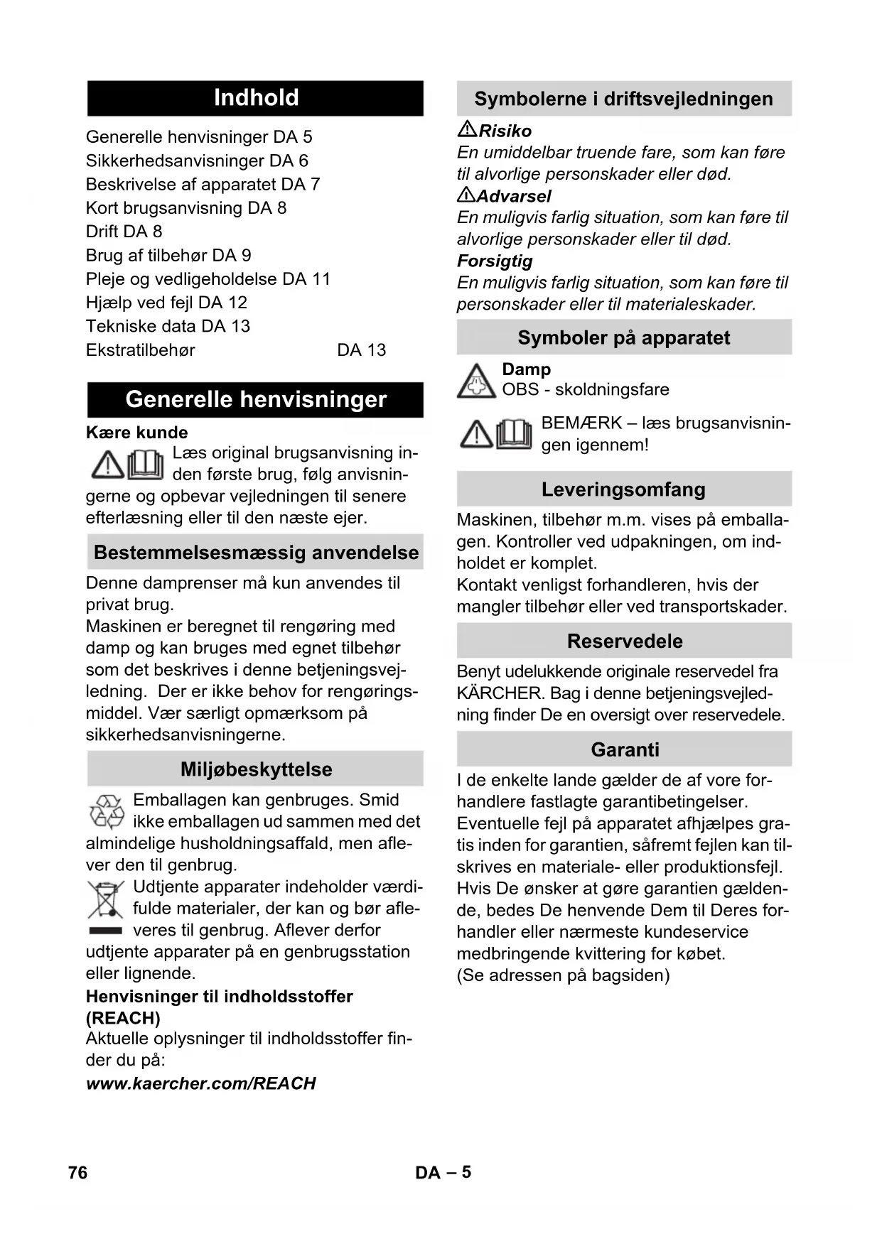 ter sig fast. Man kan høre et stille klik. Dette påvirker ikke dampudstrømningen. Ved vandmangel i vandtanken blinker kon- trollampen - vandmangel rødt og der høres et signal. Kort brugsanvisning Drift Montering af tilbehør Adskillelse af tilbehør Fyldning af vandtank Tag vandtanken af Direkte på apparatet Tænd for maskinen Efterfyldning af vand 79DA– 9 Bemærk: Når der er for lidt vand i damp- kedlen, leder vandpumpen automatisk vand fra vandtanken til dampkedlen. Hvis vandtanken er tom, kan vandpumpen ikke mere fylde dampkedlen og dampudtagnin- gen blokeres. Fyld vandtanken op til markeringen "MAX". Bemærk: I korte invervaller forsøger vand- pumpen at fylde dampkedlen. Hvis der sker påfyldning, frigives dampudtagningen igen, den røde kontrollampe slukker. Med omstilleren til dampmængden regule- res den udstrømmende dampmængde. Omstilleren har tre stillinger: Sæt omstilleren til den ønskede damp- mængde. Tryk damphåndtaget, ret først damppi- stolen mod en klud, indtil dampen kom- mer ud jævnt. Tryk på kontakten - Sluk for at slukke for renseren. Træk netstikket ud af stikkontakten. Tryk låget på damprenserens stikdåse ned og træk dampstikket ud af stikdå- sen. Udtømning af restvand fra vandtanken. Figur - Sæt rundbørsten ind i en lille holder til tilbehør. Sæt hånddysen og punktstråledysen hver på et forlængerrør. Sæt forlængerrør ind i den store holder til tilbehør. Hæng gulvdysen ind i parkeringsholderen. Dampslangen vikles omkring forlæn- gerrørene og damppistolen sættes ind i gulvdysen. Strømledningen opbevares i den dertil egnede beholder. Det anbefales at feje eller suge gulvet før brugen af damprenseren. På den måde fjernes tilsmudsning/løse partikler allerede før vådrensningen. Inden tekstiler behandles med damprense- ren, skal man altid kontrollere tekstilernes forligelighed et skjult sted: Afdamp teksti- lernes først, lad tekstilerne tørre og kontrol- ler så tekstilernes farve og form. Ved rengøring af lakerede/malede eller kunststofcoatede overflader som f.eks. køkken- og almindelige møbler, døre, par- ket kan der løsnes voks, møbelpolitur, kunststofcoating eller farve eller der kan opstå pletter. Ved rengøring af disse over- flader damp ført en klud og visk med kluden over overfladen. Forsigtig Dampen må ikke rettes mod limede kanter, det kan løsne limen. Renseren må ikke bru- ges til rengøring af uforseglede træ- eller parketgulve. Regulering af dampmængde maksimalt dampmængde reduceret dampmængde ingen damp -børnesikring Bemærk: I denne stilling kan damp- håndtaget ikke betjenes. Sluk for maskinen Opbevaring af damprenseren Brug af tilbehør Vigtige oplysninger om anvendelse Rensning af gulve Opfriskning af tekstiler Rengøring af laminerede eller lakerede overflader 80 DA– 10 Ved lave udendørstemperaturer, især om vinteren, bør ruden opvarmes idet hele gla- soverfladen afdampes. På den måde und- gås spændinger på overfladen, som kan føre til et glasbrud. Rens derefter vinduet med hånddysen og overtræk. Brug rudeafstyrgeren til at fjerne vand eller tør overfladen med en klud. Forsigtig For at undgå skader, må dampen ikke ret- tes mod forseglede steder på vinduesram- men. Damppistolen kan også anvendes uden til- behør, f.eks.: – til at fjerne lugter og folder fra hængen- de tøj idet tøjet afdampes med en af- stand på 10-20 cm. – til afstøvning af planter. Overhold her en afstand på 20-40 cm. – til våd fjernelse af støv idet kluden af- dampes og derefter bruges til at rense møblerne. Jo nærmere dysen holdes imod de tilsmud- sede steder, desto stærkere er rengørings- effekten fordi temperaturen og dampen er højest ved dysens udslip. Især praktisk til rengøring af utilgængelige steder, fuger, armaturer, afløb, vaskekummer, wc'er, per- sienner eller radiatorer. Før damprengørin- gen kan man dryppe eddike eller citronsyre på stærke aflejringer, lad det indvirke 5 mi- nutter og afdamp så. Rundbørsten kan monteres på punktstråle- dysen som supplering. Via børstning kan hårdnakkede tilsmudsninger lettere fjernes. Forsigtig Ikke egnet til rengøring af sensitive overflader. Figur Monter rundbørsten på punktstråledysen. Træk venligst frottéovertrækket over hånd- dysen. Især velegnet til små overflader, som kan vaskes, brusekabiner og spejl. Egnet til alle væg- og gulvbelægninger som kan vaskes, f.eks. stengulve, fliser og PVC- gulve. Sørg for at arbejde langsomt på me- get snavsede flader, så dampen har læn- gere tid at virke i. Bemærk: Rester af rengøringsmidler eller plejeemulsioner, som stadig sidder på den overflade som skal renses, kan forårsage striber ved damprengøringen. Disse striber forsvinder dog efter flere anvendelser. Figur Fastgør gulvkluden på gulvdysen. 1 Fold gulvkluden på langs og sæt gulv- dysen på kluden. 2 Åbn holdeklemmerne. 3 Læg kludens endestykke ind i åbningen. 4 Luk holdeklemmerne. Forsigtig Fingrene må ikke være imellem klemmerne. Figur Ved pauser hænges gulvdysen i parke- ringsholderen. Risiko Dampstrygejernet må ikke bruges, hvis det faldt ned, hvis det har synlige ska- der eller er utæt. Varmt dampstrygejern og varm dampstråle! Henvis andre personer til mulige farer for skoldning. Dampstrålen må aldrig rettes mod personer eller dyr (skoldningsfare). Varmet strygejern må ikke komme i kontakt med el-ledninger eller brændbare genstande. 몇 Advarsel Under opvarmningen eller nedkølingen skal dampstrygejernet og dets strøm- ledning være udenfor rækkevidden af børn, som er yngre end 8 år. Dampstrygejernet skal buges og opbe- vares på en stabil overflade. Rengøring af glas Damppistol Punktstråledyse Rundbørste Hånddyse Gulvdyse Parkere gylvdysen Strygejern 81DA– 11 Bemærk: Vi anbefaler, at De anvender strygebordet fra KÄRCHER med aktiv– dampopsugning (2.884-933.0). Dette stry- gebord er optimalt tilpasset Deres nye en- hed. Det gør strygningen væsentligt lettere og hurtiger