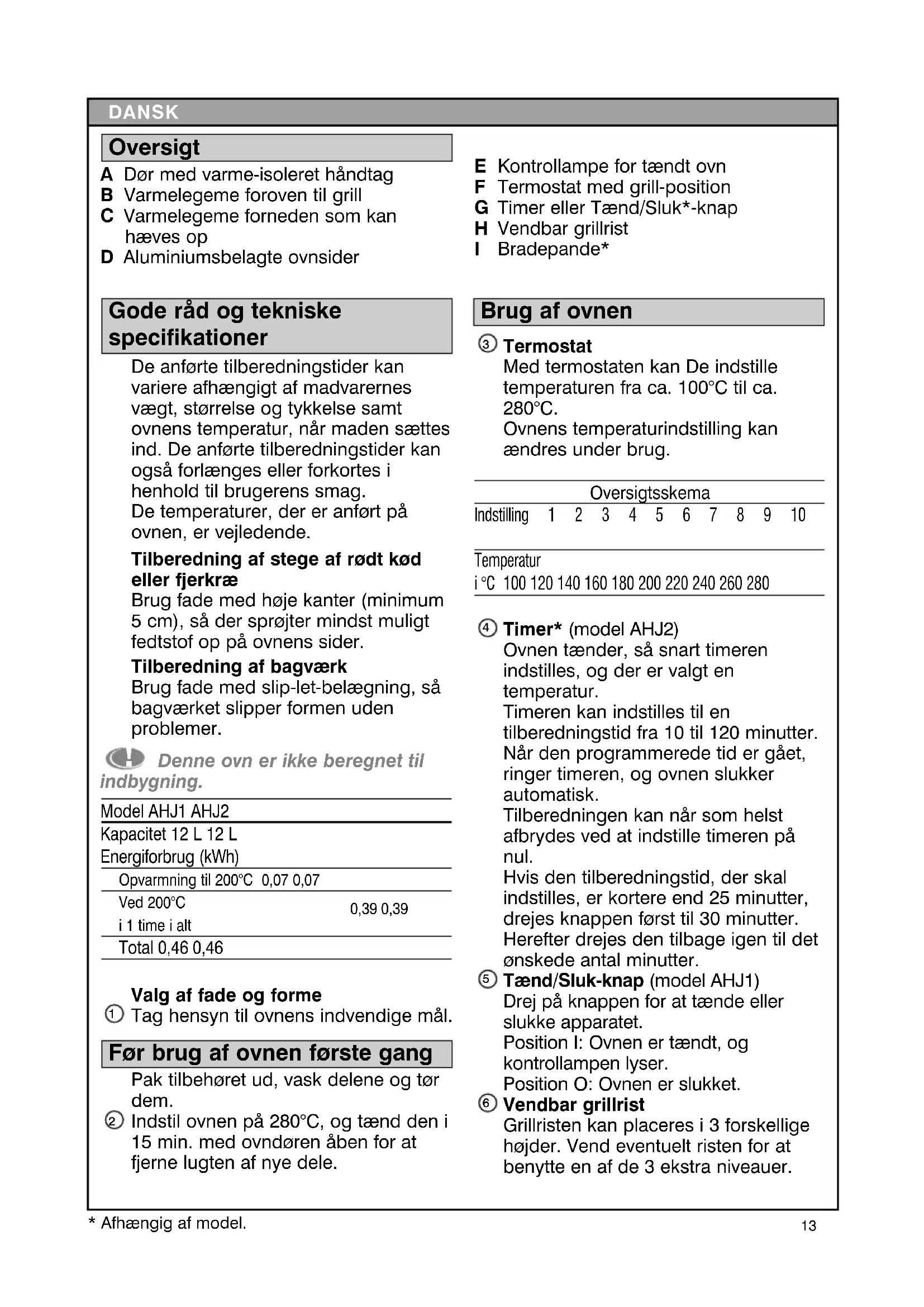 - This appliance is designed for domestic use only. Any commercial use, inappropriate use or failure to comply with the instructions, the manufacturer accepts no responsibility and the guarantee will not apply. Keep these instructions in a safe place If you have any product problem or query, please contact our Customer Relations team first for expert help and advice: Helpline:0845 602 1454 - UK - (01) 4751947 - Ireland13 DANSK Gode råd og tekniske specifikationer De anførte tilberedningstider kan variere afhængigt af madvarernes vægt, størrelse og tykkelse samt ovnens temperatur, når maden sættes ind. De anførte tilberedningstider kan også forlænges eller forkortes i henhold til brugerens smag. De temperaturer, der er anført på ovnen, er vejledende. Tilberedning af stege af rødt kød eller fjerkræ Brug fade med høje kanter (minimum 5 cm), så der sprøjter mindst muligt fedtstof op på ovnens sider. Tilberedning af bagværk Brug fade med slip-let-belægning, så bagværket slipper formen uden problemer. Denne ovn er ikke beregnet til indbygning. Model AHJ1 AHJ2 Kapacitet 12 L 12 L Energiforbrug (kWh) Opvarmning til 200°C 0,07 0,07 Ved 200°C 0,39 0,39 i 1 time i alt Total 0,46 0,46 Valg af fade og forme Tag hensyn til ovnens indvendige mål. Før brug af ovnen første gang Pak tilbehøret ud, vask delene og tør dem. Indstil ovnen på 280°C, og tænd den i 15 min. med ovndøren åben for at fjerne lugten af nye dele. Brug af ovnen Termostat Med termostaten kan De indstille temperaturen fra ca. 100°C til ca. 280°C. Ovnens temperaturindstilling kan ændres under brug. Oversigtsskema Indstilling 1 2 3 4 5 6 7 8 9 10 Temperatur i °C 100 120 140 160 180 200 220 240 260 280 Timer* (model AHJ2) Ovnen tænder, så snart timeren indstilles, og der er valgt en temperatur. Timeren kan indstilles til en tilberedningstid fra 10 til 120 minutter. Når den programmerede tid er gået, ringer timeren, og ovnen slukker automatisk. Tilberedningen kan når som helst afbrydes ved at indstille timeren på nul. Hvis den tilberedningstid, der skal indstilles, er kortere end 25 minutter, drejes knappen først til 30 minutter. Herefter drejes den tilbage igen til det ønskede antal minutter. Tænd/Sluk-knap (model AHJ1) Drej på knappen for at tænde eller slukke apparatet. Position I: Ovnen er tændt, og kontrollampen lyser. Position O: Ovnen er slukket. Vendbar grillrist Grillristen kan placeres i 3 forskellige højder. Vend eventuelt risten for at benytte en af de 3 ekstra niveauer.