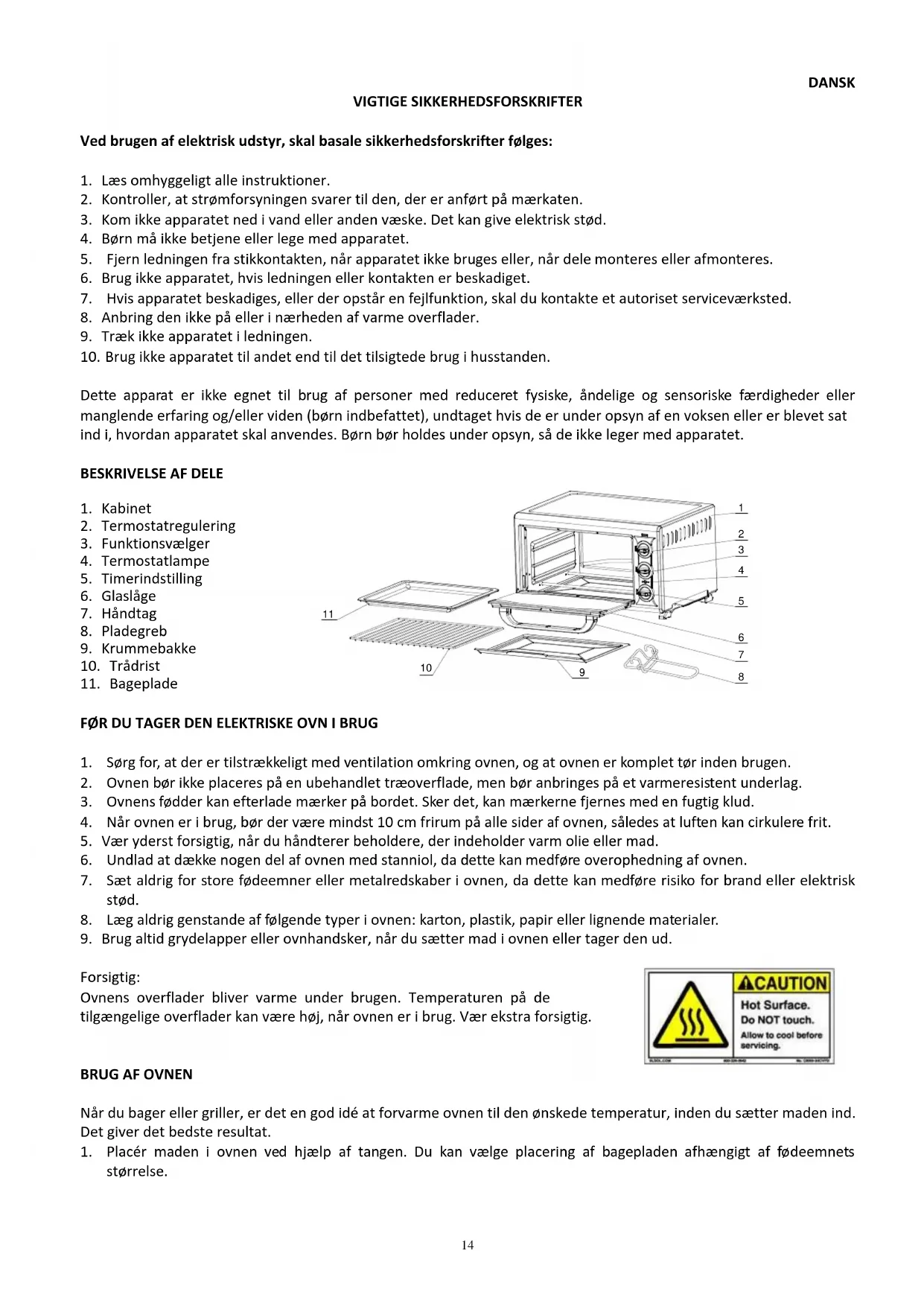 Forsigtig: Ovnens overflader bliver varme under brugen. Temperaturen på de tilgængelige overflader kan være høj, når ovnen er i brug. Vær ekstra forsigtig.