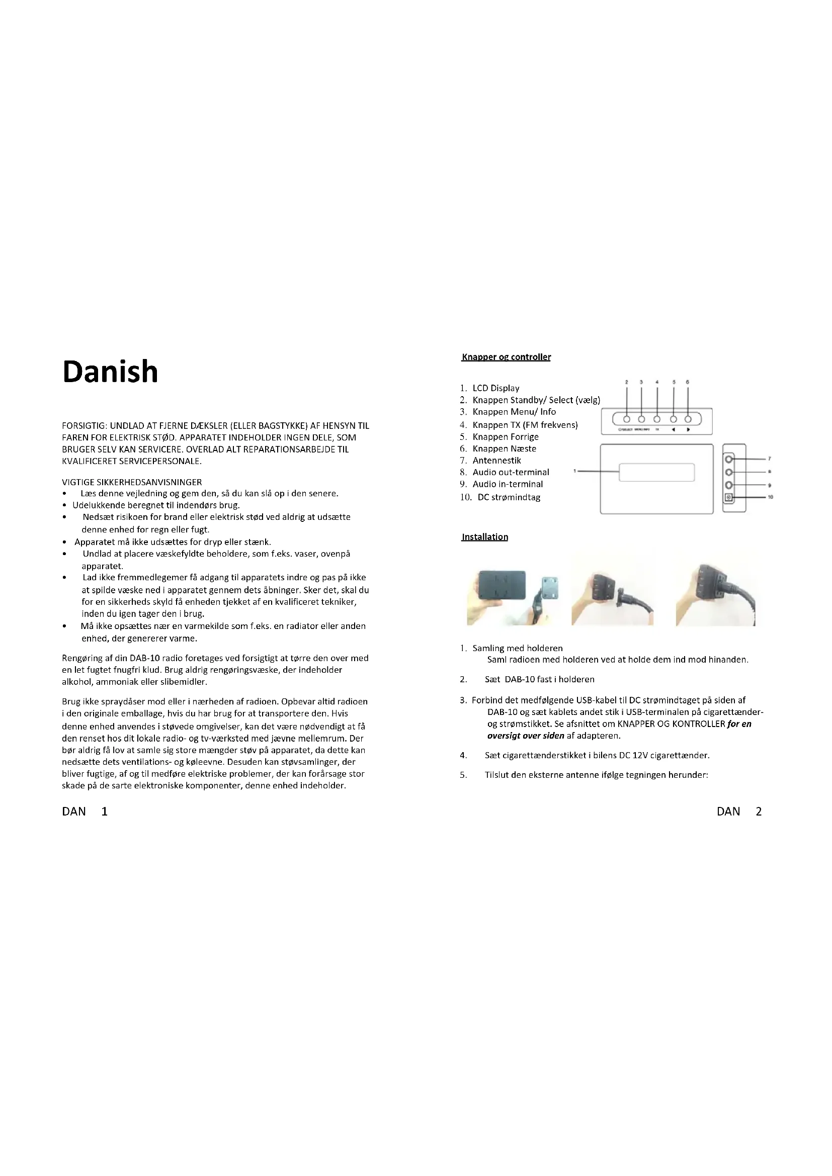 - Må ikke opsættes nær en varmekilde som f.eks. en radiator eller anden enhed, der genererer varme. Rengøring af din DAB-10 radio foretages ved forsigtigt at tørre den over med en let fugtet fnugfri klud. Brug aldrig rengøringsvæske, der indeholder alkohol, ammoniak eller slibemidler. Brug ikke spraydåser mod eller i nærheden af radioen. Opbevar altid radioen i den originale emballage, hvis du har brug for at transportere den. Hvis denne enhed anvendes i støvede omgivelser, kan det være nødvendigt at få den renset hos dit lokale radio- og tv-værksted med jævne mellemrum. Der bør aldrig få lov at samle sig store mængder støv på apparatet, da dette kan nedsætte dets ventilations- og køleevne. Desuden kan støvsamlinger, der bliver fugtige, af og til medføre elektriske problemer, der kan forårsage stor skade på de sarte elektroniske komponenter, denne enhed indeholder. Knapper og controller