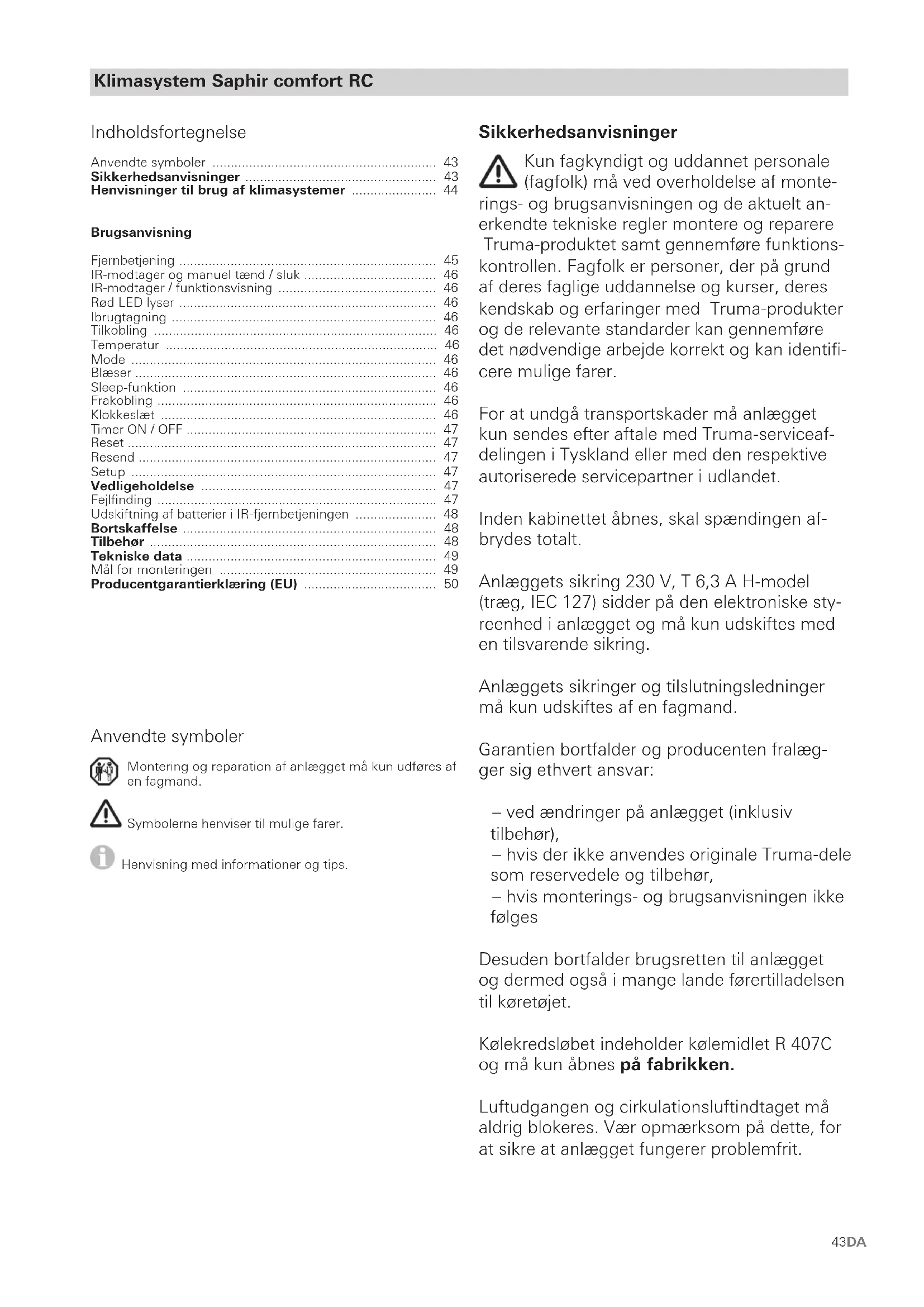 - De garantie dient bij een geautoriseerde servicepartner of bij het Truma Servicecentrum te worden geclaimd. Alle adressen en telefoonnummers zijn te vinden op www.truma.com in het gedeelte „Service“. Het adres van de fabrikant luidt: Truma Gerätetechnik GmbH & Co. KG Truma Servicezentrum Wernher-von- Braun-Straße 12 85640 Putzbrunn, Bondsrepubliek Duitsland Om een soepel verloop te garanderen, verzoeken wij bij het opnemen van contact de volgende informatie bij de hand te houden: – gedetailleerde beschrijving van het gebrek – serienummer van het apparaat – datum aankoop De geautoriseerde servicepartner of het Truma Servicecen- trum bepalen telkens de verder te volgen werkwijze. Om eventuele transportschade te voorkomen, mag het betref- fende apparaat uitsluitend na voorafgaand overleg met de geautoriseerde servicepartner of het Truma Servicecentrum worden verzonden. Wordt het garantiegeval door de fabrikant erkend, dan neemt de fabrikant de transportkosten voor zijn rekening. Is er geen sprake van een garantiegeval, dan wordt de consument daarover geïnformeerd en komen de reparatie- en transportkosten voor zijn rekening. Wij verzoeken af te zien van het opsturen zonder voorafgaand overleg.43DA Sikkerhedsanvisninger Kun fagkyndigt og uddannet personale (fagfolk) må ved overholdelse af monte- rings- og brugsanvisningen og de aktuelt an- erkendte tekniske regler montere og reparere Truma-produktet samt gennemføre funktions- kontrollen. Fagfolk er personer, der på grund af deres faglige uddannelse og kurser, deres kendskab og erfaringer med Truma-produkter og de relevante standarder kan gennemføre det nødvendige arbejde korrekt og kan identifi- cere mulige farer. For at undgå transportskader må anlægget kun sendes efter aftale med Truma-serviceaf- delingen i Tyskland eller med den respektive autoriserede servicepartner i udlandet. Inden kabinettet åbnes, skal spændingen af- brydes totalt. Anlæggets sikring 230 V, T 6,3 A H-model (træg, IEC 127) sidder på den elektroniske sty- reenhed i anlægget og må kun udskiftes med en tilsvarende sikring. Anlæggets sikringer og tilslutningsledninger må kun udskiftes af en fagmand. Garantien bortfalder og producenten fralæg- ger sig ethvert ansvar: – ved ændringer på anlægget (inklusiv tilbehør), – hvis der ikke anvendes originale Truma-dele som reservedele og tilbehør, – hvis monterings- og brugsanvisningen ikke følges Desuden bortfalder brugsretten til anlægget og dermed også i mange lande førertilladelsen til køretøjet. Kølekredsløbet indeholder kølemidlet R 407C og må kun åbnes på fabrikken. Luftudgangen og cirkulationsluftindtaget må aldrig blokeres. Vær opmærksom på dette, for at sikre at anlægget fungerer problemfrit. Klimasystem Saphir comfort RC Indholdsfortegnelse Anvendte symboler p. 43