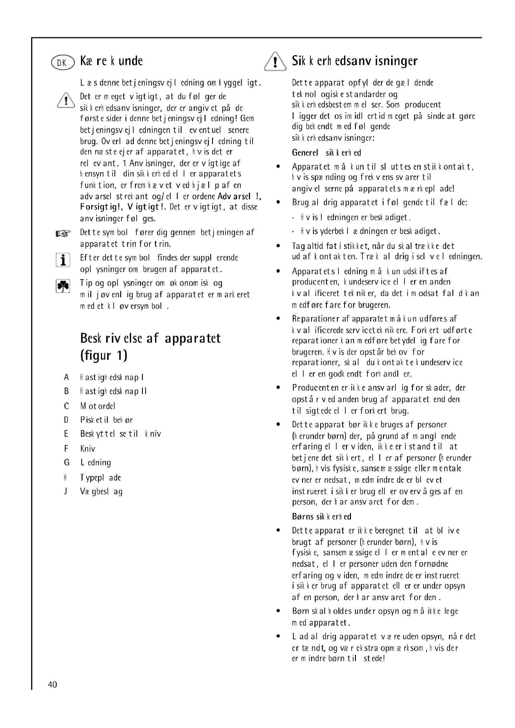 - EM C direk tiivi (säh k öm agneettinen yh teensopivuus) 89 /336/EEC ja seurannaism uutok set 9 2/31/EEC ja 9 3/68/EEC40 Kæ re k unde Læ s denne betjeningsvejledning om h yggeligt. Det er m eget vigtigt, at du følger de sik k erh edsanvisninger, der er angivet på de første sider i denne betjeningsvejledning! Gem betjeningsvejledningen til eventuel senere brug. Overlad denne betjeningsvejledning til den næ ste ejer af apparatet, h vis det er relevant. 1 Anvisninger, der er vigtige af h ensyn til din sik k erh ed eller apparatets funk tion, er frem h æ vet ved h jæ lp af en advarselstrek ant og/eller ordene Advarsel!, Forsigtig!, Vigtigt!. Det er vigtigt, at disse anvisninger følges. Dette sym bol fører dig gennem betjeningen af apparatet trin for trin. Efter dette sym bol findes der supplerende oplysninger om brugen af apparatet. Tip og oplysninger om øk onom isk og m iljøvenlig brug af apparatet er m ark eret m ed et k løversym bol. Besk rivelse af apparatet (figur 1) A H astigh edsk nap I B H astigh edsk nap II C M otordel D Pisk etilbeh ør E Besk yttelse til k niv F Kniv G Ledning H Typeplade J Væ gbeslag Sik k erh edsanvisninger Dette apparat opfylder de gæ ldende tek nologisk e standarder og sik k erh edsbestem m elser. Som producent ligger det os im idlertid m eget på sinde at gøre dig bek endt m ed følgende sik k erh edsanvisninger: Generel sik k erh ed