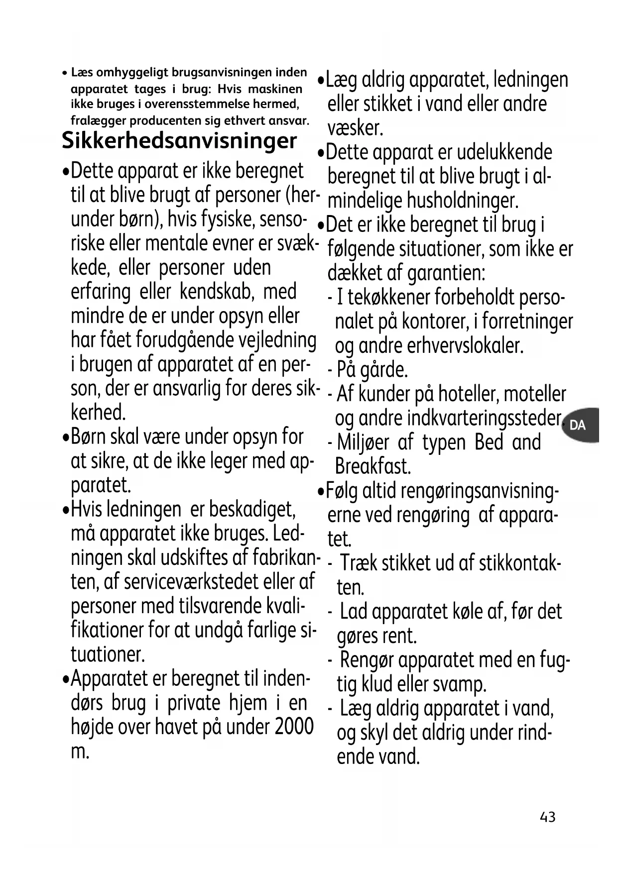 - Dette apparat er ikke beregnet til at blive brugt af personer (her- under børn), hvis fysiske, senso- riske eller mentale evner er svæk- kede, eller personer uden erfaring eller kendskab, med mindre de er under opsyn eller har fået forudgående vejledning i brugen af apparatet af en per- son, der er ansvarlig for deres sik- kerhed.