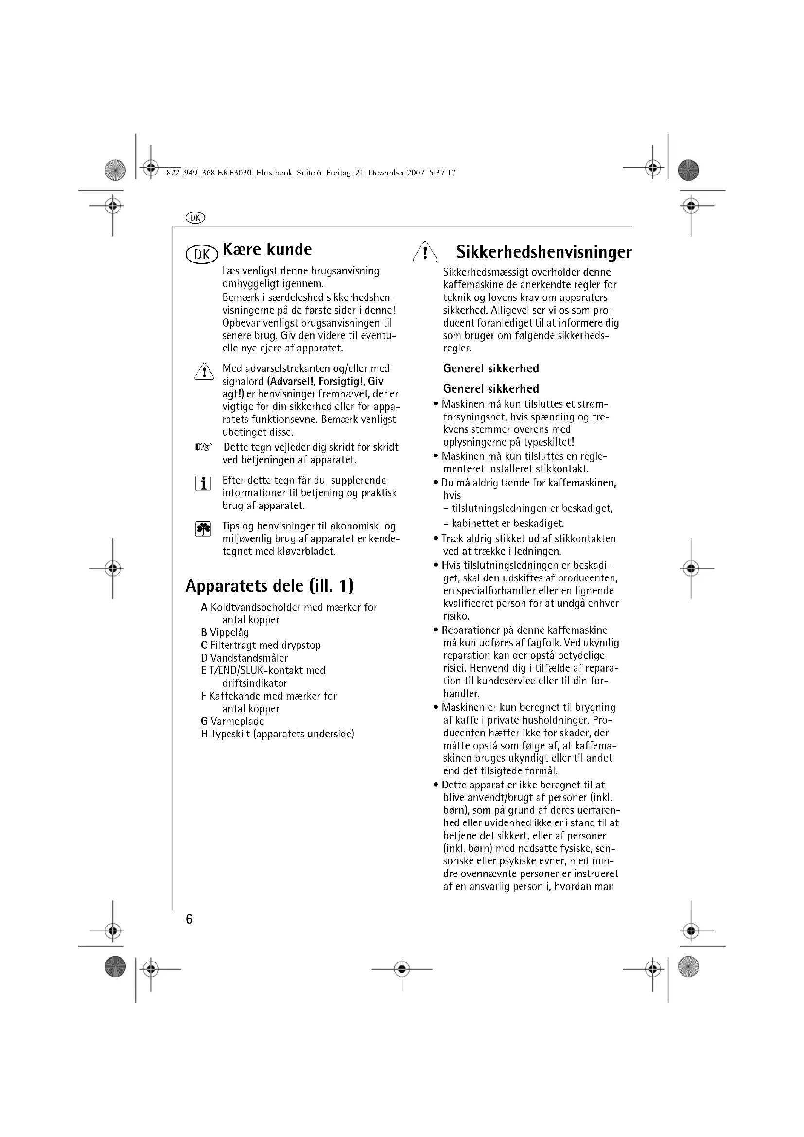 Kære kunde Læs venligst denne brugsanvisning omhyggeligt igennem.Bemærk i særdeleshed sikkerhedshen-visningerne på de første sider i denne! Opbevar venligst brugsanvisningen til senere brug. Giv den videre til eventu-elle nye ejere af apparatet. Med advarselstrekanten og/eller med signalord (Advarsel!, Forsigtig!, Giv agt!) er henvisninger fremhævet, der er vigtige for din sikkerhed eller for appa-ratets funktionsevne. Bemærk venligst ubetinget disse.0 Dette tegn vejleder dig skridt for skridt ved betjeningen af apparatet. Efter dette tegn får du supplerende informationer til betjening og praktisk brug af apparatet. Tips og henvisninger til økonomisk og miljøvenlig brug af apparatet er kende-tegnet med kløverbladet. Apparatets dele (ill. 1) A Koldtvandsbeholder med mærker for antal kopperB VippelågC Filtertragt med drypstopD VandstandsmålerE TÆND/SLUK-kontakt med driftsindikatorF Kaffekande med mærker for antal kopperG VarmepladeH Typeskilt (apparatets underside) 1 Sikkerhedshenvisninger Sikkerhedsmæssigt overholder denne kaffemaskine de anerkendte regler for teknik og lovens krav om apparaters sikkerhed. Alligevel ser vi os som pro-ducent foranlediget til at informere dig som bruger om følgende sikkerheds-regler.Generel sikkerhedGenerel sikkerhed• Maskinen må kun tilsluttes et strøm-forsyningsnet, hvis spænding og fre-kvens stemmer overens med oplysningerne på typeskiltet!• Maskinen må kun tilsluttes en regle-menteret installeret stikkontakt.• Du må aldrig tænde for kaffemaskinen, hvis – tilslutningsledningen er beskadiget,– kabinettet er beskadiget.• Træk aldrig stikket ud af stikkontakten ved at trække i ledningen.• Hvis tilslutningsledningen er beskadi-get, skal den udskiftes af producenten, en specialforhandler eller en lignende kvalificeret person for at undgå enhver risiko.• Reparationer på denne kaffemaskine må kun udføres af fagfolk. Ved ukyndig reparation kan der opstå betydelige risici. Henvend dig i tilfælde af repara-tion til kundeservice eller til din for-handler.• Maskinen er kun beregnet til brygning af kaffe i private husholdninger. Pro-ducenten hæfter ikke for skader, der måtte opstå som følge af, at kaffema-skinen bruges ukyndigt eller til andet end det tilsigtede formål.• Dette apparat er ikke beregnet til at blive anvendt/brugt af personer (inkl. børn), som på grund af deres uerfaren-hed eller uvidenhed ikke er i stand til at betjene det sikkert, eller af personer (inkl. børn) med nedsatte fysiske, sen-soriske eller psykiske evner, med min-dre ovennævnte personer er instrueret af en ansvarlig person i, hvordan man 822_949_368 EKF3030_Elux.book Seite 6 Freitag, 21. Dezember 2007 5:37 17k