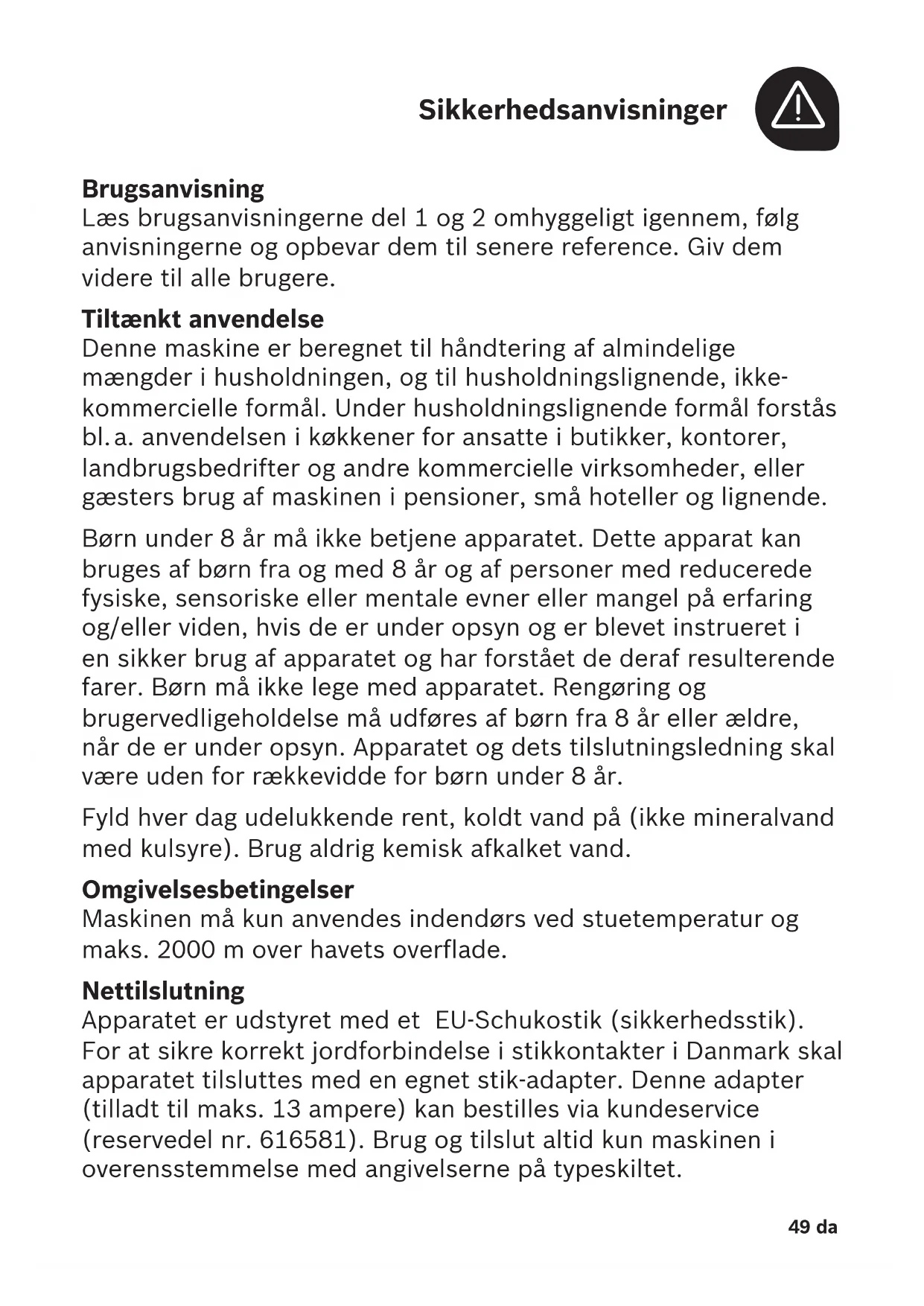 Brugsanvisning Læs brugsanvisningerne del1 og 2 omhyggeligt igennem, følg anvisningerne og opbevar dem til senere reference. Giv dem videre til alle brugere. Tiltænkt anvendelse Denne maskine er beregnet til håndtering af almindelige mængder i husholdningen, og til husholdningslignende, ikke- kommercielle formål. Under husholdningslignende formål forstås bl. a. anvendelsen i køkkener for ansatte i butikker, kontorer, landbrugsbedrifter og andre kommercielle virksomheder, eller gæsters brug af maskinen i pensioner, små hoteller og lignende. Børn under 8 år må ikke betjene apparatet. Dette apparat kan bruges af børn fra og med 8 år og af personer med reducerede fysiske, sensoriske eller mentale evner eller mangel på erfaring og/eller viden, hvis de er under opsyn og er blevet instrueret i en sikker brug af apparatet og har forstået de deraf resulterende farer. Børn må ikke lege med apparatet. Rengøring og brugervedligeholdelse må udføres af børn fra 8 år eller ældre, når de er under opsyn. Apparatet og dets tilslutningsledning skal være uden for rækkevidde for børn under 8 år. Fyld hver dag udelukkende rent, koldt vand på (ikke mineralvand med kulsyre). Brug aldrig kemisk afkalket vand. Omgivelsesbetingelser Maskinen må kun anvendes indendørs ved stuetemperatur og maks. 2000m over havets overflade. Nettilslutning Apparatet er udstyret med et EU-Schukostik (sikkerhedsstik). For at sikre korrekt jordforbindelse i stikkontakter i Danmark skal apparatet tilsluttes med en egnet stik-adapter. Denne adapter (tilladt til maks. 13ampere) kan bestilles via kundeservice (reservedel nr. 616581). Brug og tilslut altid kun maskinen i overensstemmelse med angivelserne på typeskiltet.50da TASSIMO-maskinen må kun anvendes, hvis netledningen og maskinen ikke er beskadigede. Reparationer Træk omgående netstikket ud ved fejlfunktion. Reparationer på maskinen, fx udskiftning af en beskadiget netledning, må kun foretages af vores kundeservice for at undgå risici. Fare for forbrænding! Prøv aldrig at åbne bryggesystemet under driften. Væropmærksom på, at udstrømmende væsker er meget varme. TDISC’en, stanseanordningen og udløbstuden til drikke kan være meget varme umiddelbart efter brygningen. Lad delene afkøle først. Anvend ingen beskadigede TDISCs. Anvend TDISCs kun én gang. Fare for elektrisk stød! Sluk maskinen med TÆND / SLUK knappen og træk netstikket ud inden rengøring. Nedsænk aldrig maskinen eller netledningen i vand. Fare for tilskadekomst! Drik under ingen omstændigheder afkalkningsvæske. Strømbesparelse For at spare strøm bør du slukke din TASSIMO-maskine efter hver brug. Sikkerhedsanvisninger a51 da 1 TÆND / SLUK-knap 2 START / STOP tast 3 Displayelementer a Standby