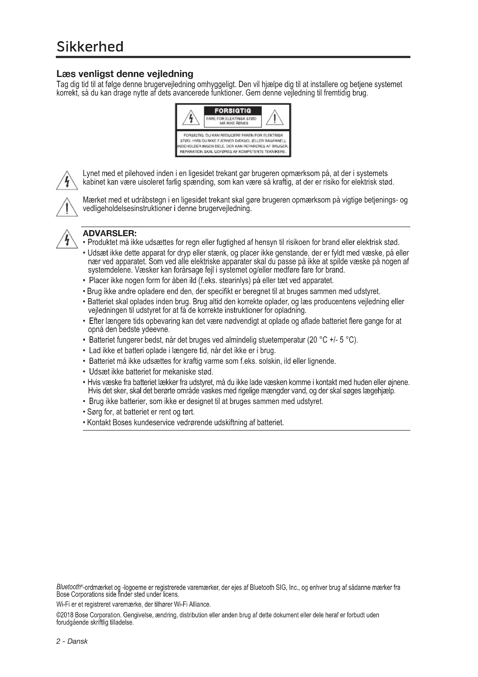 -ordmærket og -logoerne er registrerede varemærker, der ejes af Bluetooth SIG, Inc., og enhver brug af sådanne mærker fra BoseCorporationssidenderstedunderlicens. Wi-Fi er et registreret varemærke, der tilhører Wi-Fi Alliance. ©2018 Bose Corporation. Gengivelse, ændring, distribution eller anden brug af dette dokument eller dele heraf er forbudt uden forudgående skriftlig tilladelse.Dansk - 3 Sikkerhed ADVARSEL: Dette produkt indeholder magnetisk materiale. Kontakt din læge, hvis du er i tvivl om, hvorvidt dette kan påvirke din implanterbare medicinske enheds funktion. FORSIGTIG: Undlad at foretage ændringer af systemet eller tilbehør. Uautoriserede ændringer kan sætte sikkerheden, overholdelse af lovbestemmelser samt systemets ydeevne over styr. NOTER: