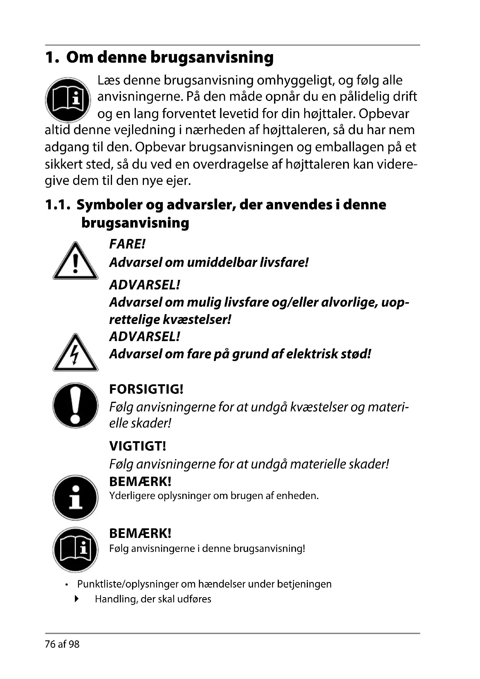 Læs denne brugsanvisning omhyggeligt, og følg alle anvisningerne. På den måde opnår du en pålidelig drift og en lang forventet levetid for din højttaler. Opbevar altid denne vejledning i nærheden af højttaleren, så du har nem adgang til den. Opbevar brugsanvisningen og emballagen på et sikkert sted, så du ved en overdragelse af højttaleren kan videre- give dem til den nye ejer. 1.1. Symboler og advarsler, der anvendes i denne brugsanvisning FARE! Advarsel om umiddelbar livsfare! ADVARSEL! Advarsel om mulig livsfare og/eller alvorlige, uop- rettelige kvæstelser! ADVARSEL! Advarsel om fare på grund af elektrisk stød! FORSIGTIG! Følg anvisningerne for at undgå kvæstelser og materi- elle skader! VIGTIGT! Følg anvisningerne for at undgå materielle skader! BEMÆRK! Yderligere oplysninger om brugen af enheden. BEMÆRK! Følg anvisningerne i denne brugsanvisning!