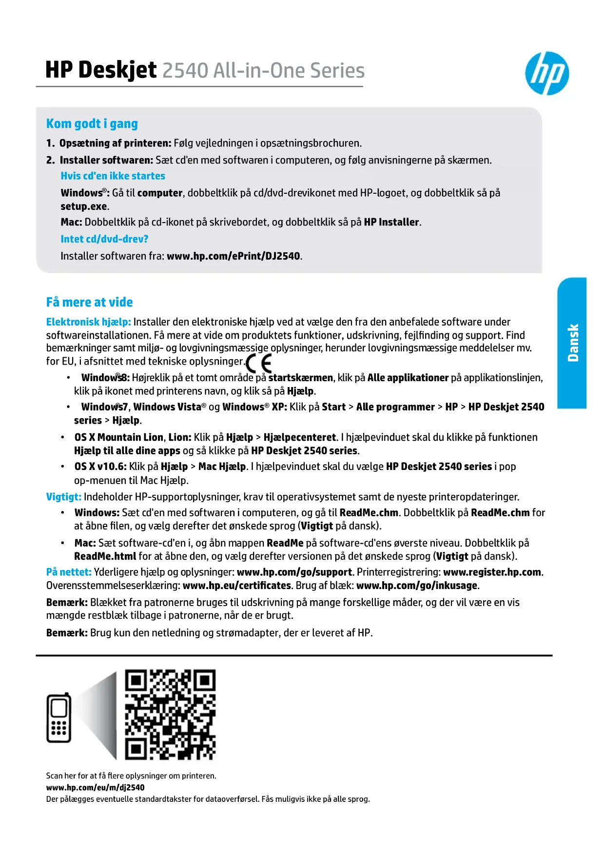 : Gå til computer, dobbeltklik på cd/dvd-drevikonet med HP-logoet, og dobbeltklik så på setup.exe. Mac: Dobbeltklik på cd-ikonet på skrivebordet, og dobbeltklik så på HP Installer. Intet cd/dvd-drev? Installer softwaren fra: www.hp.com/ePrint/DJ2540. Få mere at vide Elektronisk hjælp: Installer den elektroniske hjælp ved at vælge den fra den anbefalede software under softwareinstallationen. Få mere at vide om produktets funktioner, udskrivning, fejlnding og support. Find bemærkninger samt miljø- og lovgivningsmæssige oplysninger, herunder lovgivningsmæssige meddelelser mv. for EU, i afsnittet med tekniske oplysninger.