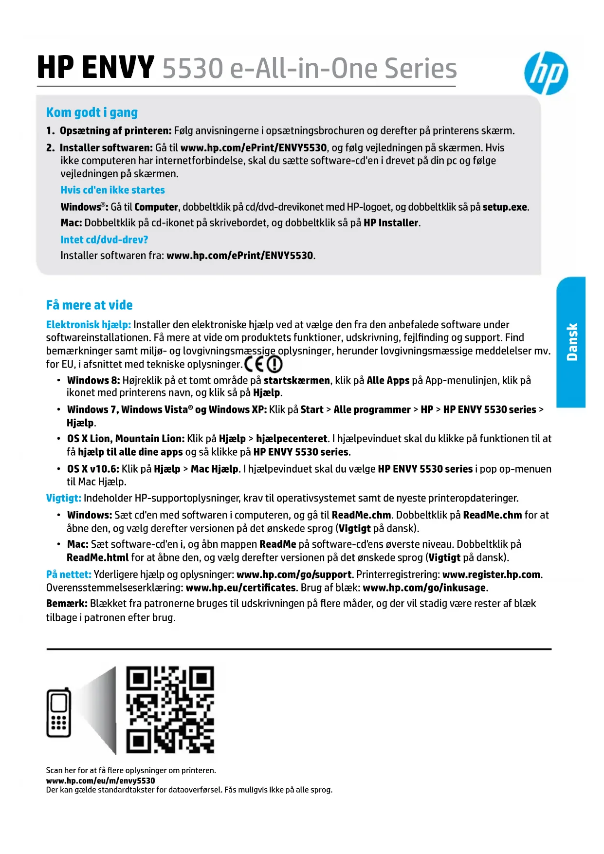 - Mac: Sæt software-cd'en i, og åbn mappen ReadMe på software-cd'ens øverste niveau. Dobbeltklik på ReadMe.html for at åbne den, og vælg derefter versionen på det ønskede sprog (Vigtigt på dansk). På nettet: Yderligere hjælp og oplysninger: www.hp.com/go/support. Printerregistrering: www.register.hp.com. Overensstemmelseserklæring: www.hp.eu/certicates. Brug af blæk: www.hp.com/go/inkusage. Bemærk: Blækket fra patronerne bruges til udskrivningen på ere måder, og der vil stadig være rester af blæk tilbage i patronen efter brug. Scan her for at få ere oplysninger om printeren. www.hp.com/eu/m/envy5530Der kan gælde standardtakster for dataoverførsel. Fås muligvis ikke på alle sprog. Dansk56 Kontrolpanel