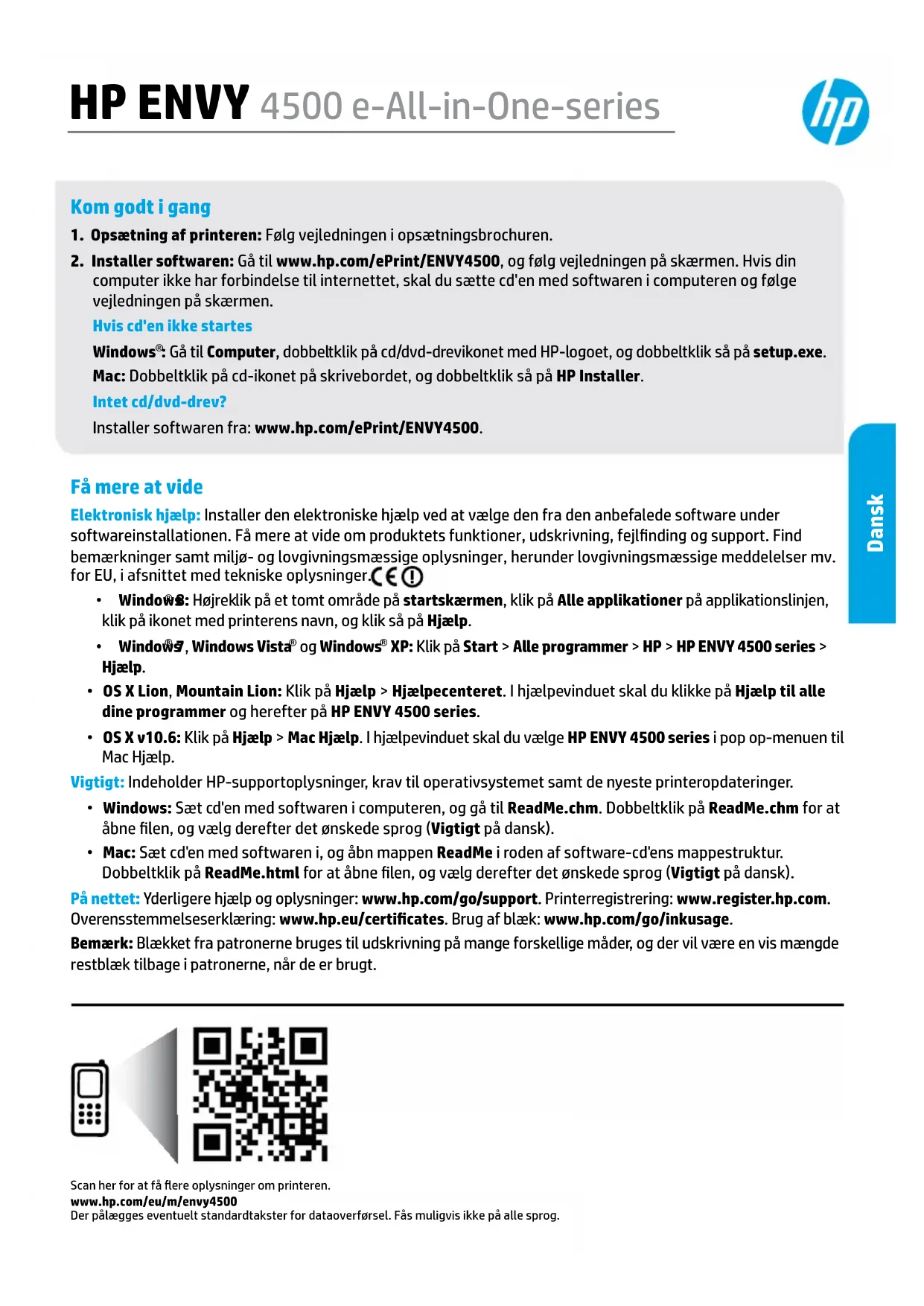 - Mac: Sæt cd'en med softwaren i, og åbn mappen ReadMe i roden af software-cd'ens mappestruktur. Dobbeltklik på ReadMe.html for at åbne len, og vælg derefter det ønskede sprog (Vigtigt på dansk). På nettet: Yderligere hjælp og oplysninger: www.hp.com/go/support. Printerregistrering: www.register.hp.com. Overensstemmelseserklæring: www.hp.eu/certicates. Brug af blæk: www.hp.com/go/inkusage. Bemærk: Blækket fra patronerne bruges til udskrivning på mange forskellige måder, og der vil være en vis mængde restblæk tilbage i patronerne, når de er brugt. Scan her for at få ere oplysninger om printeren. www.hp.com/eu/m/envy4500Der pålægges eventuelt standardtakster for dataoverførsel. Fås muligvis ikke på alle sprog. Dansk56 Kontrolpanel
