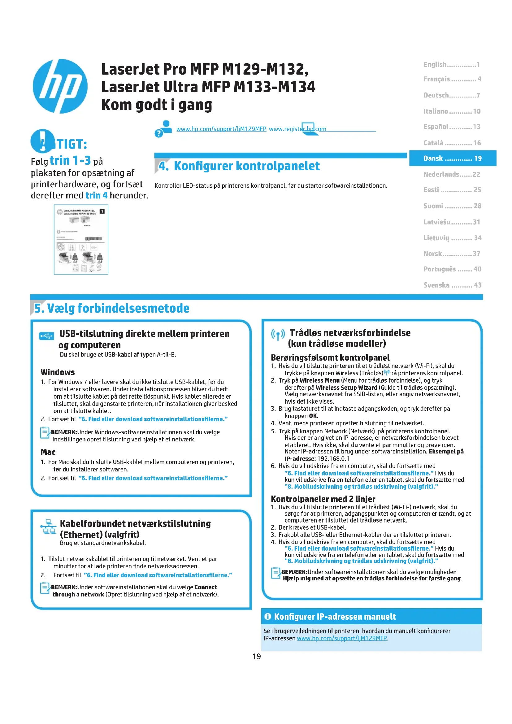 BEMÆRK: Under softwareinstallationen skal du vælge Connect through a network (Opret tilslutning ved hjælp af et netværk).www.hp.com/support/ljM129MFP www.register.hp.com USB-tilslutning direkte mellem printeren og computeren Du skal bruge et USB-kabel af typen A-til-B. VIGTIGT: Følg trin 1-3 på plakaten for opsætning af printerhardware, og fortsæt derefter med trin 4 herunder.