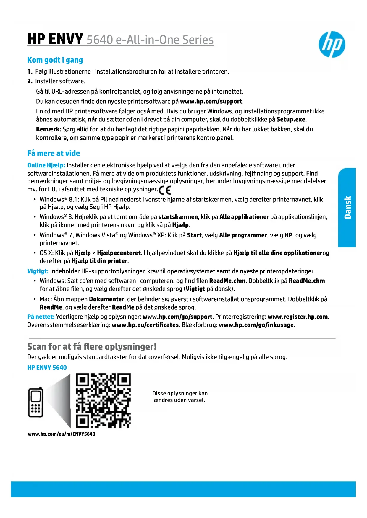 EKSKLUDERER, BEGRENSER ELLER ENDRER, MEN KOMMER I TILLEGG TIL, DE OBLIGATORISKE LOVBESTEMTE RETTIGHETENE SOM GJELDER FOR SALGET AV HP-PRODUKTENE TIL SLIKE KUNDER. Informasjon om HPs begrensede garanti Vedlagt finner du navn og adresse på de HP-selskaper som svarer for fabrikkgarantien i Norge. Norge: Hewlett-Packard Norge AS, Østensjøveien 32, 0667 OSLO, Norge Utover dette kan du ha oppnådd rettigheter gjennom kjøpsavtalen med selgeren av ditt HP-produkt dersom du er en forbruker etter norsk forbrukerkjøpslov. Slike rettigheter innskrenkes ikke av fabrikkgarantien. Den lengste absolutte reklamasjonsretten er 5 år for produkter som ved vanlig bruk er ment å vare vesentlig lengre enn 2 år (med de begrensninger som følger av norsk lovgivning og rettspraksis). Overfor selgeren kan det reklameres på ytelsen som helhet selv om garantien kun dekker deler av ytelsen som er kjøpt. Reklamasjonsretten kan tapes dersom det ikke reklameres innen rimelig tid, også innenfor den absolutte reklamasjonsperioden. HP-produkt Varighet av begrenset garanti Programvaremedier 90 dager Skriver 1 år Skriverkassetter eller blekkpatroner Til HP-blekkpatronen er oppbrukt eller utløpsdatoen for garantien som står på blekkpatronen, er nådd. Denne garantien dekker ikke blekkprodukter fra HP som er etterfylt, ombygd, brukt på feil mate eller klusset med. Skrivehoder (gjelder bare for produkter med skrivehoder 1 år som kan byttes av kunden) Tilbehør 1 år hvis ikke annet er angitt Norskwww.hp.com/eu/m/ENVY5640HP ENVY 5640Disse oplysninger kan ændres uden varsel. Scan for at få ere oplysninger! Der gælder muligvis standardtakster for dataoverførsel. Muligvis ikke tilgængelig på alle sprog. Få mere at vide Online Hjælp: Installer den elektroniske hjælp ved at vælge den fra den anbefalede software under softwareinstallationen. Få mere at vide om produktets funktioner, udskrivning, fejlnding og support. Find bemærkninger samt miljø- og lovgivningsmæssige oplysninger, herunder lovgivningsmæssige meddelelser mv. for EU, i afsnittet med tekniske oplysninger.