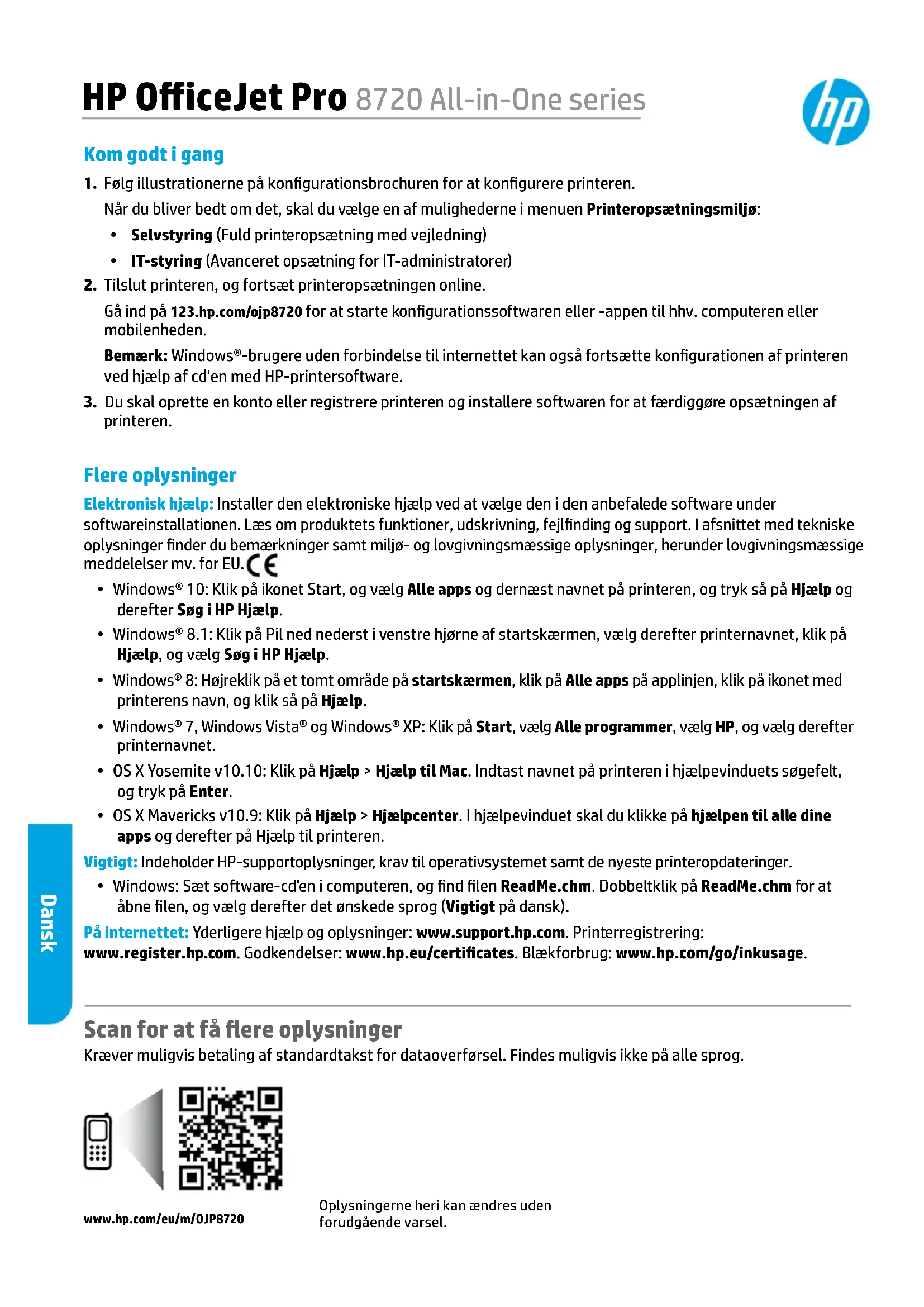 uridisk garanti. Du kan se flere oplysninger i det følgende link: Forbrugerens lovpligtige garanti (www.hp.com/go/eu-legal) eller du kan gå til webst edet for Europæiske Forbrugercentre (http:// ec.europa.eu/consumers/solving_consumer_disputes/non-judicial_redress/ecc-net/). HP-produkt Varigheden af den begrænsede garanti Printer 1 års hardwaregaranti Printer- eller blækpatroner Ved ophør af den første af følgende to perioder: Indtil HP-blækket er opbrugt, eller når den garantiperiode, der er trykt på patronen, er udløbet. Denne garanti dækker ikke HP-blækprodukter, som er blevet genopfyldt, genfremstillet, oppoleret, anvendt forkert eller manipuleret. Skrivehoveder (gælder kun produkter med 1 år skrivehoveder, som kunden selv kan udskifte) Tilbehør 1 år, medmindre andet er angivetHP OiceJet Pro 8720 All-in-One series Kom igång