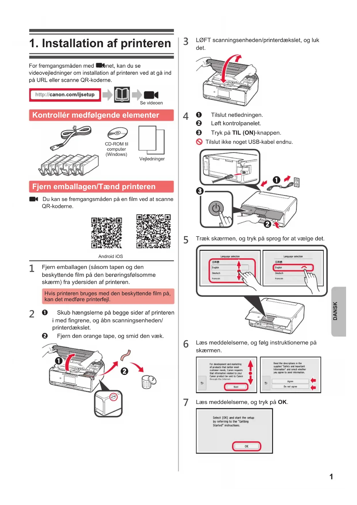 For fremgangsmåden med -ikonet, kan du se videovejledninger om installation af printeren ved at gå ind på URL eller scanne QR-koderne. Se videoen Kontrollér medfølgende elementer CD-ROM til computer (Windows)Vejledninger Fjern emballagen/Tænd printeren Du kan se fremgangsmåden på en lm ved at scanne QR-koderne. Android iOS