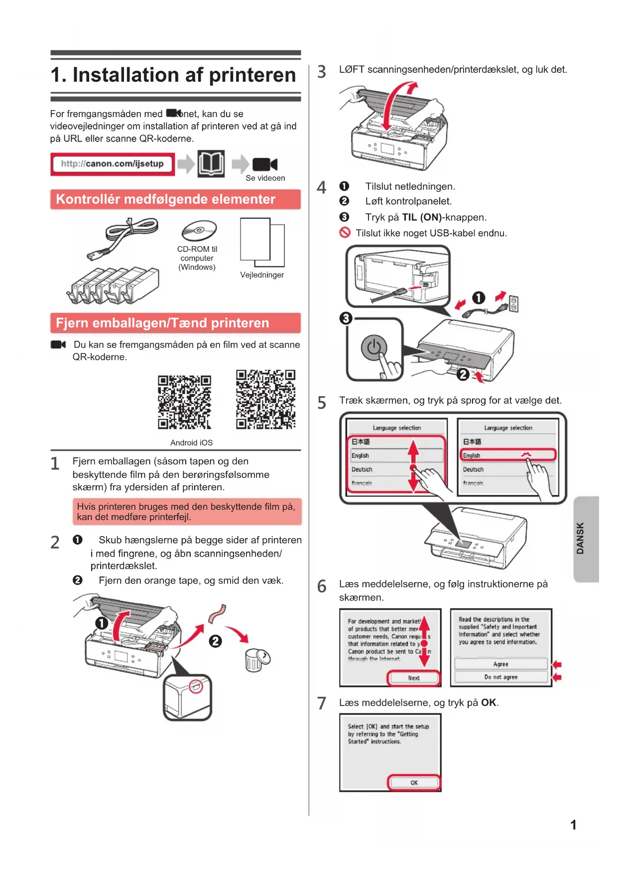 For fremgangsmåden med -ikonet, kan du se videovejledninger om installation af printeren ved at gå ind på URL eller scanne QR-koderne. Se videoen Kontrollér medfølgende elementer CD-ROM til computer (Windows)Vejledninger Fjern emballagen/Tænd printeren Du kan se fremgangsmåden på en lm ved at scanne QR-koderne. Android iOS