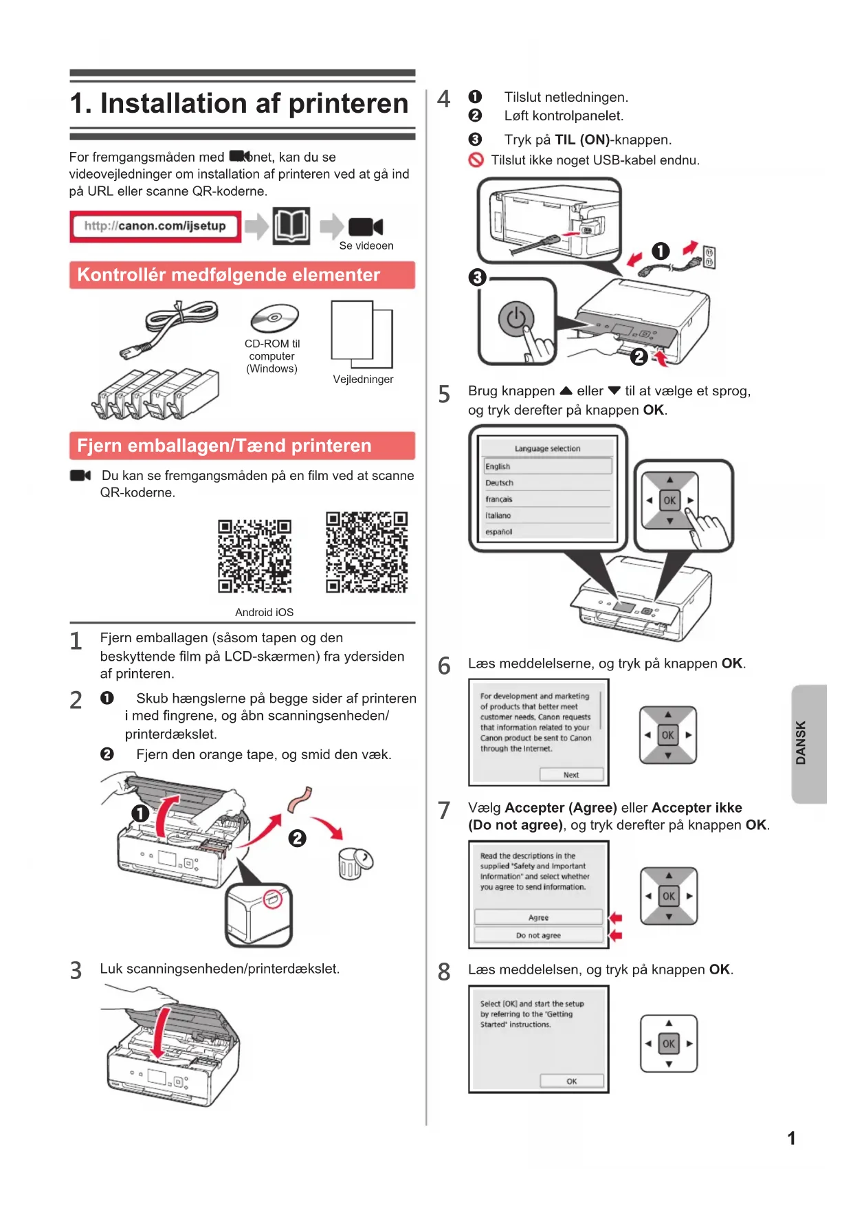 For fremgangsmåden med -ikonet, kan du se videovejledninger om installation af printeren ved at gå ind på URL eller scanne QR-koderne. Se videoen Kontrollér medfølgende elementer CD-ROM til computer (Windows)Vejledninger Fjern emballagen/Tænd printeren Du kan se fremgangsmåden på en lm ved at scanne QR-koderne. Android iOS