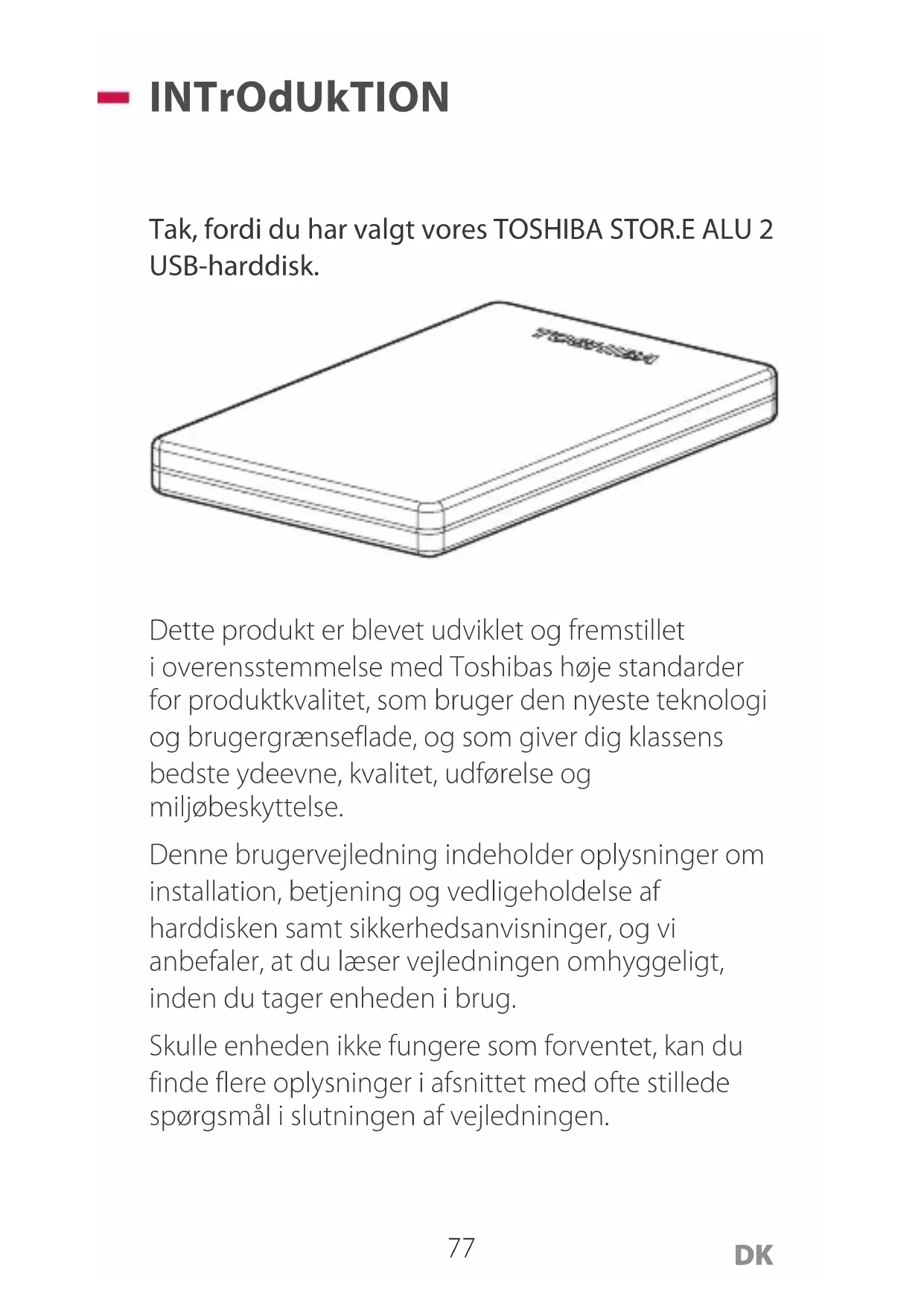 INTrOdUkTION Tak, fordi du har valgt vores TOSHIBA STOR.E ALU 2 USB-harddisk. Dette produkt er blevet udviklet og fremstillet i overensstemmelse med Toshibas høje standarder for produktkvalitet, som bruger den nyeste teknologi og brugergrænseflade, og som giver dig klassens bedste ydeevne, kvalitet, udførelse og miljøbeskyttelse. Denne brugervejledning indeholder oplysninger om installation, betjening og vedligeholdelse af harddisken samt sikkerhedsanvisninger, og vi anbefaler, at du læser vejledningen omhyggeligt, inden du tager enheden i brug. Skulle enheden ikke fungere som forventet, kan du finde flere oplysninger i afsnittet med ofte stillede spørgsmål i slutningen af vejledningen.78