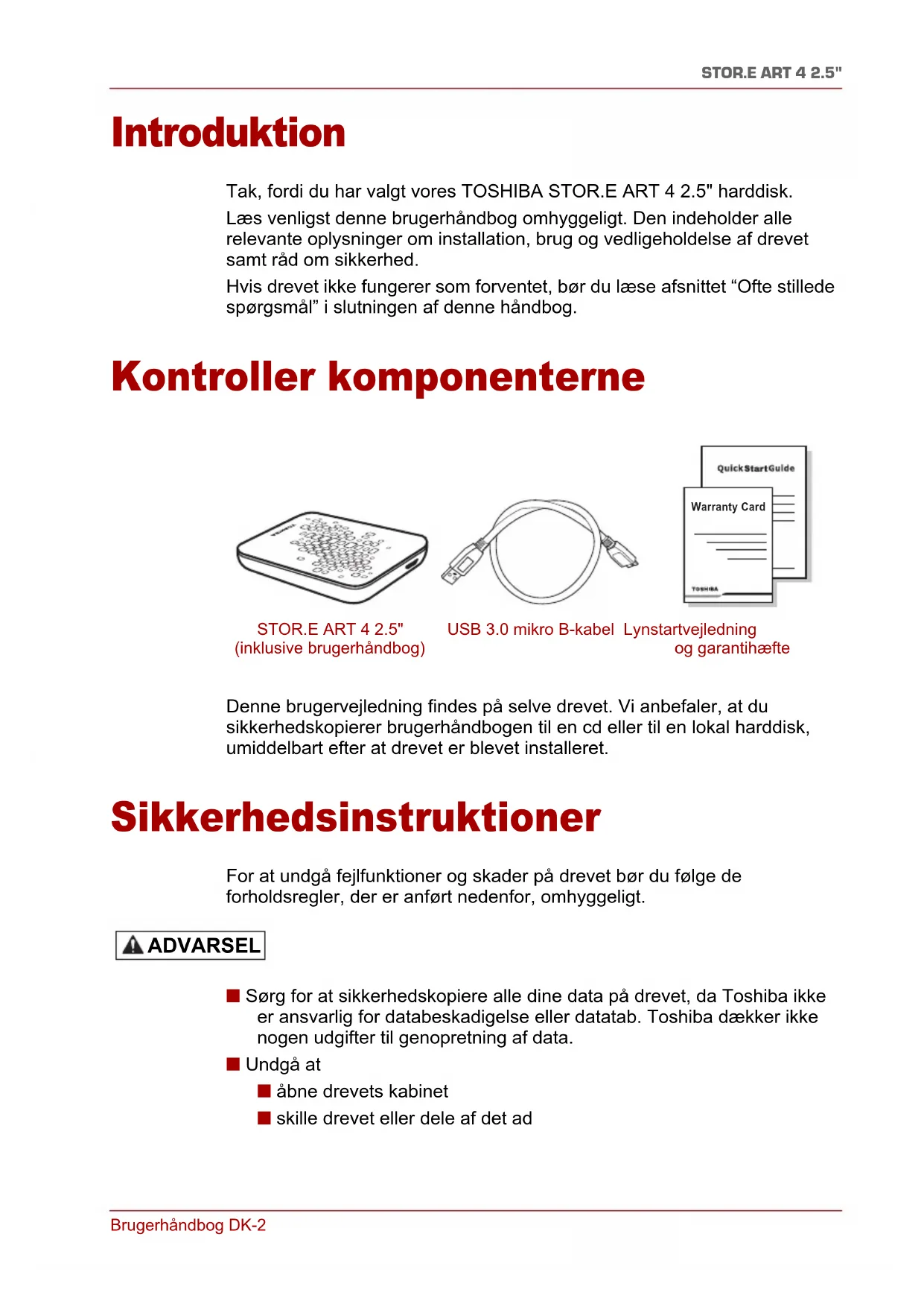 Introduktion Tak, fordi du har valgt vores TOSHIBA STOR.E ART 4 2.5" harddisk. Læs venligst denne brugerhåndbog omhyggeligt. Den indeholder alle relevante oplysninger om installation, brug og vedligeholdelse af drevet samt råd om sikkerhed. Hvis drevet ikke fungerer som forventet, bør du læse afsnittet “Ofte stillede spørgsmål” i slutningen af denne håndbog. Kontroller komponenterne Denne brugervejledning findes på selve drevet. Vi anbefaler, at du sikkerhedskopierer brugerhåndbogen til en cd eller til en lokal harddisk, umiddelbart efter at drevet er blevet installeret. Sikkerhedsinstruktioner For at undgå fejlfunktioner og skader på drevet bør du følge de forholdsregler, der er anført nedenfor, omhyggeligt. ■ Sørg for at sikkerhedskopiere alle dine data på drevet, da Toshiba ikke er ansvarlig for databeskadigelse eller datatab. Toshiba dækker ikke nogen udgifter til genopretning af data. ■ Undgå at ■ åbne drevets kabinet ■ skille drevet eller dele af det ad Warranty Card