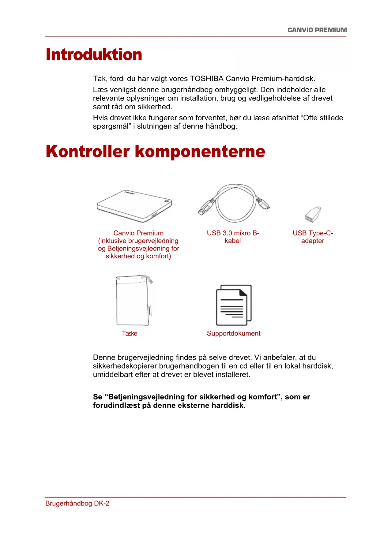 som lavere end den kapacitet, der ellers er angivet for drevet? Sv.: Denne forskel skyldes, at der anvendes forskellige metoder til at beregne kapaciteten. Harddiskproducenter bruger 10-talssystemet, mens operativsystemet bruger det binære talsystem. Eksempel på brug af 10-talssystemet: 1 TB = 1.000 GB 1 GB = 1.000 MB = 1.000.000 KB = 1.000.000.000 byte Eksempel på brug af det binære talsystem: 1 GB = 1.024 MB = 1.048.576 KB = 1.073.741.824 byte Derfor vil en harddisk på 1 TB (decimalt) i Windows se ud til kun at have 931 GB (binært). Sp.: Kan jeg bruge drevet til at kopiere et operativsystem fra én computer til en anden? Sv.: Nej. Du skal følge operativsystemleverandørens installationsvejledning. En simpel kopi vil ikke fungere. Sp.: Tilbyder Toshiba en datagendannelsesservice? Sv.: Ja, Toshiba tilbyder en datagendannelsesservice for eksterne harddiske. Tjek vores websted på www.toshiba-europe.com/services for at få flere oplysninger om denne service. Fejlfinding Min computer finder slet ikke harddisken. ■ Kontroller, at alle kabler er tilsluttet solidt. ■ Hvis drevet er tilsluttet via en USB-hub, skal du kontrollere, at den har sin egen strømforsyning. ■ Hvis du bruger et udvidelseskort, skal du kontrollere, at det fungerer korrekt og opdatere softwaren/firmwaren. Er det farligt, hvis drevet føles varmt, mens det arbejder? Sv.: Dette er normalt, og det er derfor ikke farligt.Brugerhåndbog DK-7 CANVIO PREMIUM Drevet viser meddelelsen “Enheden kan ikke starte.” Sv.: Der er to mulige årsager. Det kan være et strømproblem, og du skal i så fald kontrollere tilslutningerne. Eller der kan være noget galt med drevet, og drevet kræver i så fald service. Jeg kan se mit drev i “Denne computer”, men det vises ikke i Enhedshåndtering. Sv.: Følg disse instruktioner: