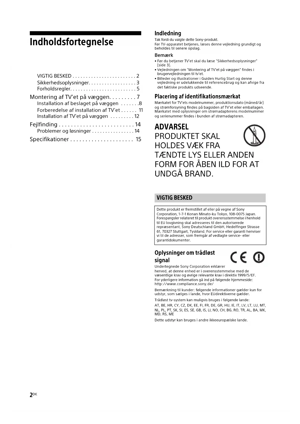 UNDGÅ BRAND. Oplysninger om trådløst signal Undertegnede Sony Corporation erklærer herved, at denne enhed er i overensstemmelse med de væsentlige krav og øvrige relevante krav i direktiv 1999/5/EF.For yderligere information gå ind på følgende hjemmeside:http://www.compliance.sony.de/Bemærkning til kunder: følgende informationer gælder kun for udstyr, som sælges i lande, hvor EUdirektiverne gælder.Trådløst tv-system kan muligvis bruges i følgende lande:AT, BE, HR, CY, CZ, DK, EE, FI, FR, DE, GR, HU, IE, IT, LV, LT, LU, MT, NL, PL, PT, SK, SI, ES, SE, GB, IS, LI, NO, CH, BG, RO, TR, AL, BA, MK, MD, RS, MEDette udstyr kan bruges i andre ikkeeuropæiske lande. VIGTIG BESKED Dette produkt er fremstillet af eller på vegne af Sony Corporation, 1-7-1 Konan Minato-ku Tokyo, 108-0075 Japan. Forespørgsler relateret til produkt overensstemmelse i henhold til EU lovgivning skal adresseres til den autoriserede repræsentant, Sony Deutschland GmbH, Hedelfinger Strasse 61, 70327 Stuttgart, Tyskland. For service eller garanti henviser vi til de adresser, som fremgår af vedlagte service- eller garantidokumenter.DK