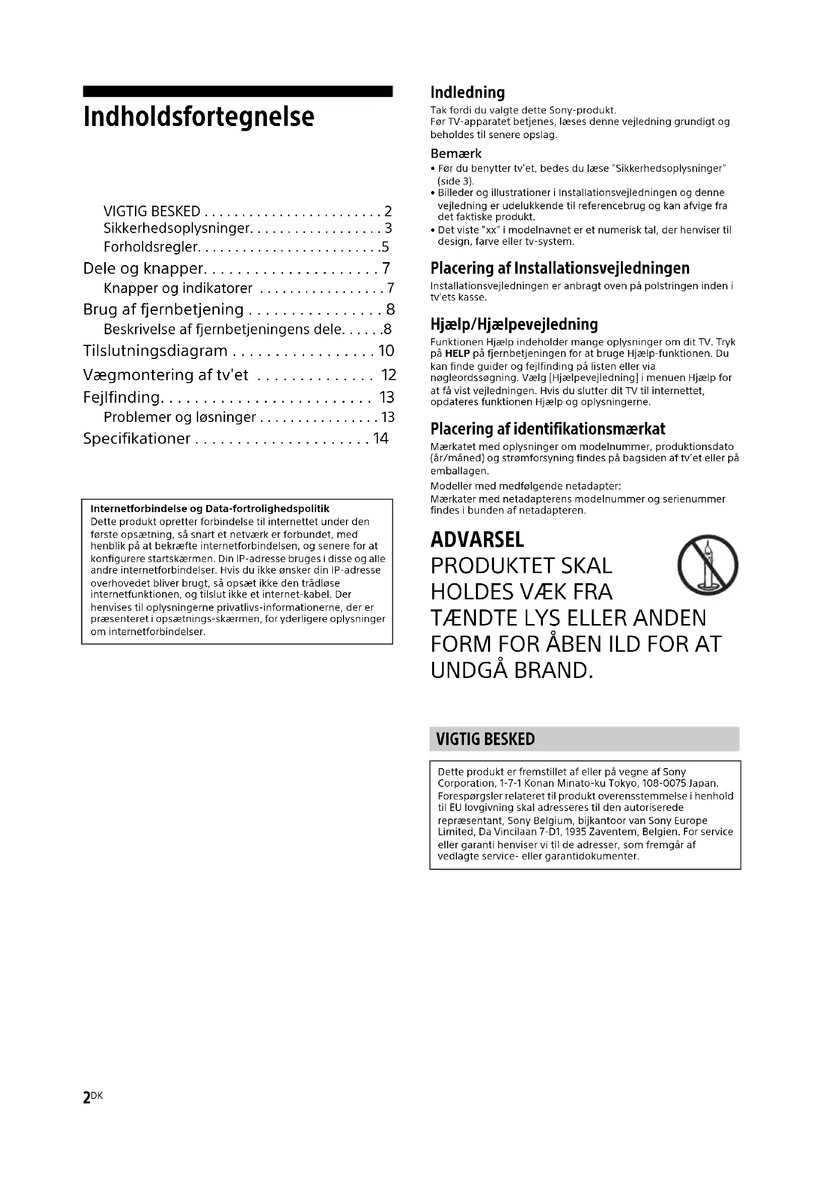 UNDGÅ BRAND. VIGTIG BESKED Dette produkt er fremstillet af eller på vegne af Sony Corporation, 1-7-1 Konan Minato-ku Tokyo, 108-0075 Japan. Forespørgsler relateret til produkt overensstemmelse i henhold til EU lovgivning skal adresseres til den autoriserede repræsentant, Sony Belgium, bijkantoor van Sony Europe Limited, Da Vincilaan 7-D1, 1935 Zaventem, Belgien. For service eller garanti henviser vi til de adresser, som fremgår af vedlagte service- eller garantidokumenter.Internetforbindelse og Data-fortrolighedspolitikDette produkt opretter forbindelse til internettet under den første opsætning, så snart et netværk er forbundet, med henblik på at bekræfte internetforbindelsen, og senere for at konfigurere startskærmen. Din IP-adresse bruges i disse og alle andre internetforbindelser. Hvis du ikke ønsker din IP-adresse overhovedet bliver brugt, så opsæt ikke den trådløse internetfunktionen, og tilslut ikke et internet-kabel. Der henvises til oplysningerne privatlivs-informationerne, der er præsenteret i opsætnings-skærmen, for yderligere oplysninger om internetforbindelser.DK