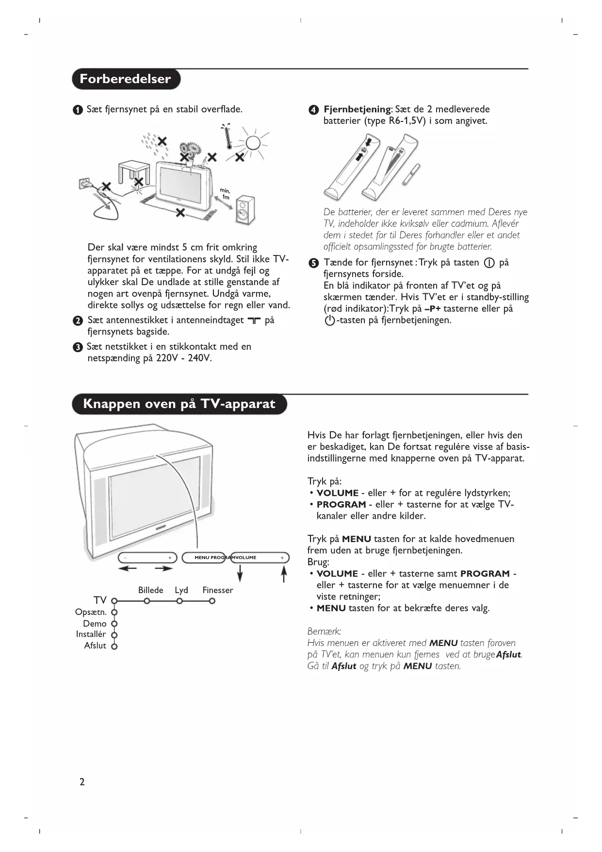 - Hvis TV’et ikke længere reagerer på signaler fra fjernbetjeningen, kan batterierne være brugt op, eller der kan være valgt forkert funktion (se afsnittet Fjernbetjening på side 3.