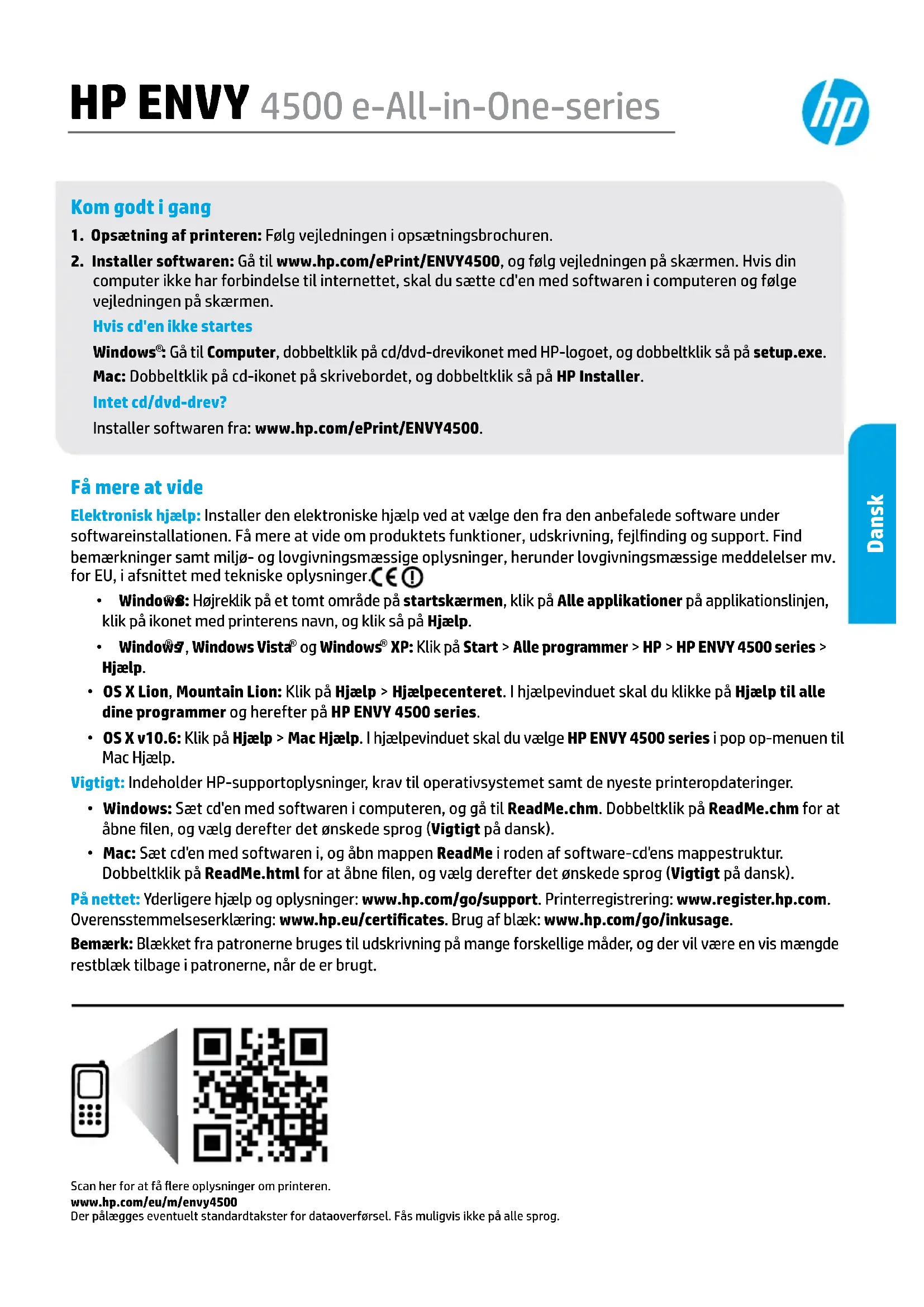 : Gå til Computer, dobbeltklik på cd/dvd-drevikonet med HP-logoet, og dobbeltklik så på setup.exe. Mac: Dobbeltklik på cd-ikonet på skrivebordet, og dobbeltklik så på HP Installer. Intet cd/dvd-drev? Installer softwaren fra: www.hp.com/ePrint/ENVY4500. Få mere at vide Elektronisk hjælp: Installer den elektroniske hjælp ved at vælge den fra den anbefalede software under softwareinstallationen. Få mere at vide om produktets funktioner, udskrivning, fejlnding og support. Find bemærkninger samt miljø- og lovgivningsmæssige oplysninger, herunder lovgivningsmæssige meddelelser mv. for EU, i afsnittet med tekniske oplysninger.