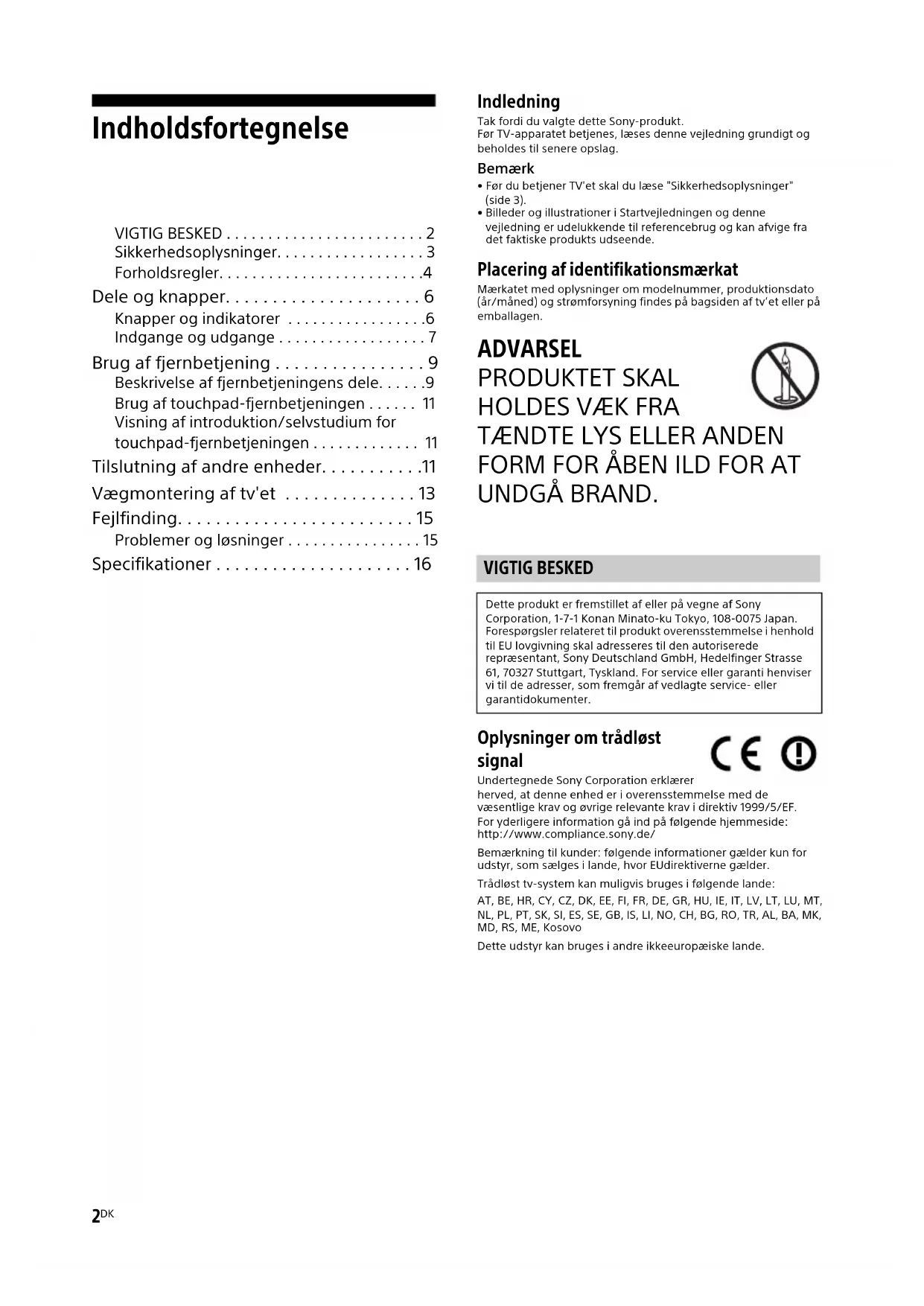 UNDGÅ BRAND. Oplysninger om trådløst signal Undertegnede Sony Corporation erklærer herved, at denne enhed er i overensstemmelse med de væsentlige krav og øvrige relevante krav i direktiv 1999/5/EF.For yderligere information gå ind på følgende hjemmeside:http://www.compliance.sony.de/Bemærkning til kunder: følgende informationer gælder kun for udstyr, som sælges i lande, hvor EUdirektiverne gælder.Trådløst tv-system kan muligvis bruges i følgende lande:AT, BE, HR, CY, CZ, DK, EE, FI, FR, DE, GR, HU, IE, IT, LV, LT, LU, MT, NL, PL, PT, SK, SI, ES, SE, GB, IS, LI, NO, CH, BG, RO, TR, AL, BA, MK, MD, RS, ME, KosovoDette udstyr kan bruges i andre ikkeeuropæiske lande. VIGTIG BESKED Dette produkt er fremstillet af eller på vegne af Sony Corporation, 1-7-1 Konan Minato-ku Tokyo, 108-0075 Japan. Forespørgsler relateret til produkt overensstemmelse i henhold til EU lovgivning skal adresseres til den autoriserede repræsentant, Sony Deutschland GmbH, Hedelfinger Strasse 61, 70327 Stuttgart, Tyskland. For service eller garanti henviser vi til de adresser, som fremgår af vedlagte service- eller garantidokumenter.DK