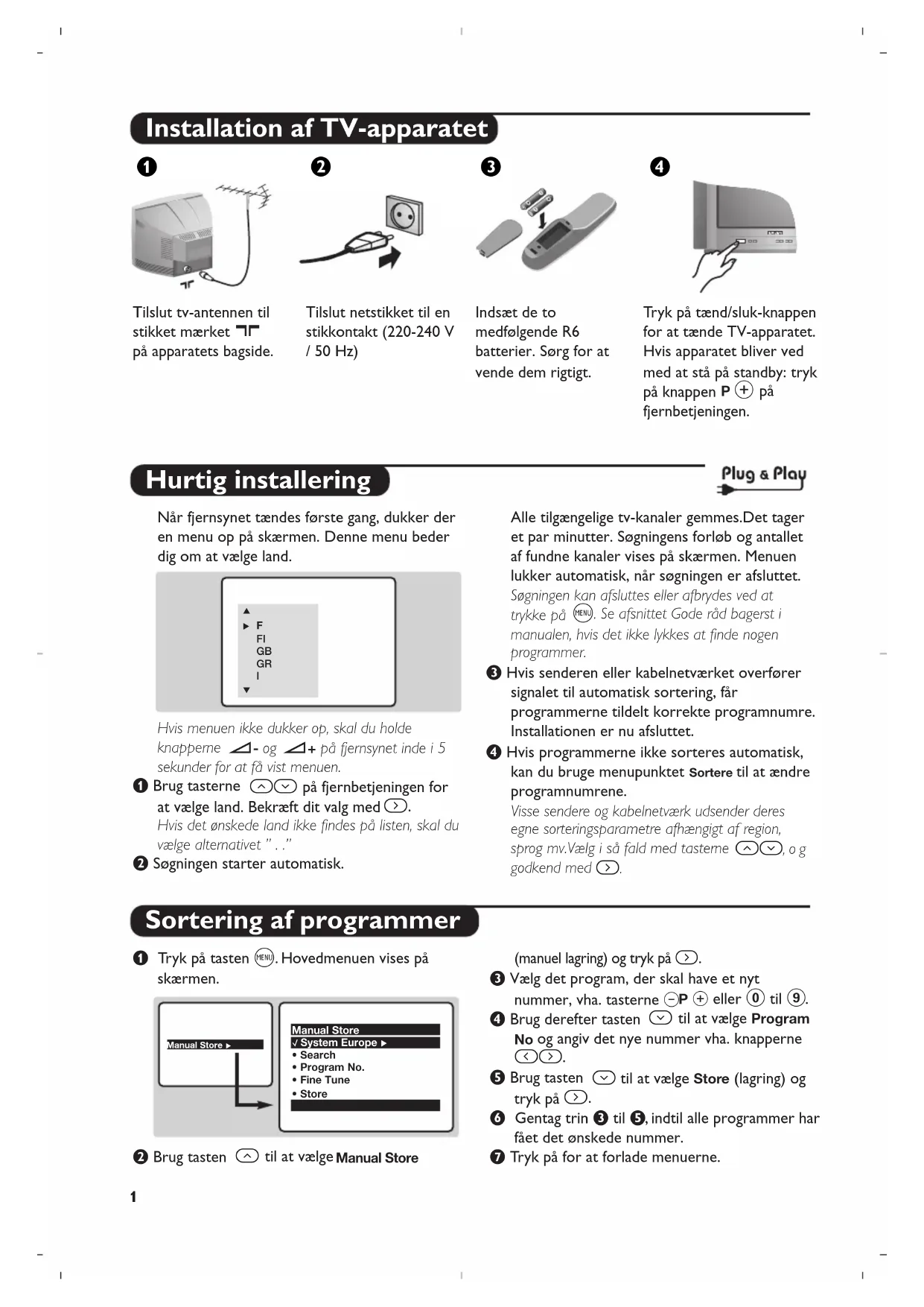 på apparatets bagside. Tilslut netstikket til en stikkontakt (220-240 V / 50 Hz) Indsæt de to medfølgende R6 batterier. Sørg for at vende dem rigtigt. Tr yk på tænd/sluk-knappen for at tænde TV-apparatet. Hvis apparatet bliver ved med at stå på standby: tryk på knappen P # på fjernbetjeningen. æÂê® Hurtig installering Sortering af programmer Når fjernsynet tændes første gang, dukker der en menu op på skærmen. Denne menu beder dig om at vælge land. Hvis menuen ikke dukker op, skal du holde knapperne ”- og ”+ på fjernsynet inde i 5 sekunder for at få vist menuen. & Brug tasterne îÏ på fjernbetjeningen for at vælge land. Bekræft dit valg med