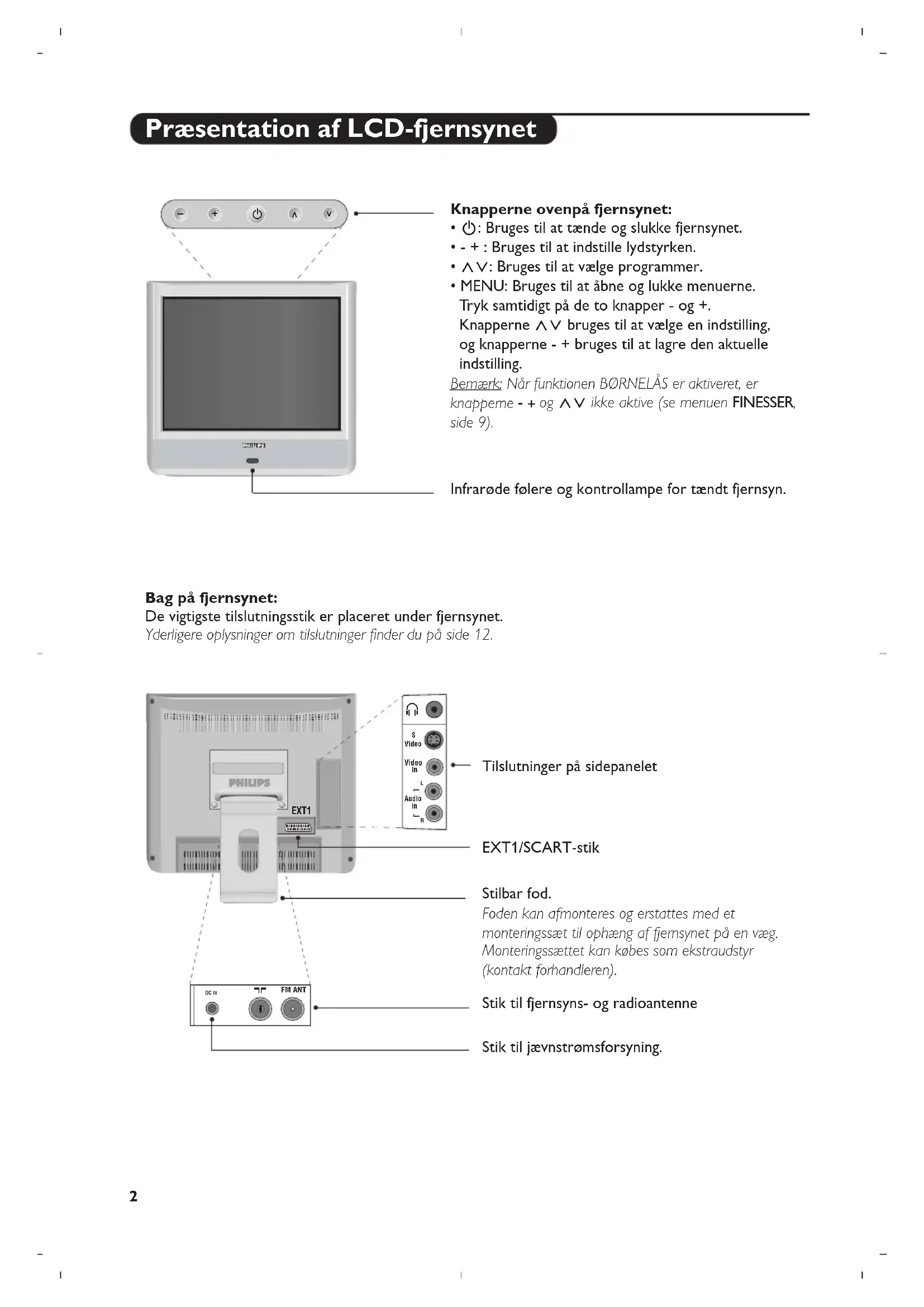- MENU: Bruges til at åbne og lukke menuerne. Tr yk samtidigt på de to knapper - og +. Knapperne <> bruges til at vælge en indstilling, og knapperne - + bruges til at lagre den aktuelle indstilling. Bemær k: Når funktionen BØRNELÅS er aktiveret, er knapperne -+og <> ikke aktive (se menuen FINESSER, side 9). Infrarøde følere og kontrollampe for tændt fjernsyn. Bag på fjernsynet: De vigtigste tilslutningsstik er placeret under fjernsynet. Yderligere oplysninger om tilslutninger finder du på side 12. EXT1/SCART-stik Tilslutninger på sidepanelet Stilbar fod. Foden kan afmonteres og erstattes med et monteringssæt til ophæng af fjernsynet på en væg. Monteringssættet kan købes som ekstraudstyr (kontakt forhandleren). Stik til fjernsyns- og radioantenne Stik til jævnstrømsforsyning.3