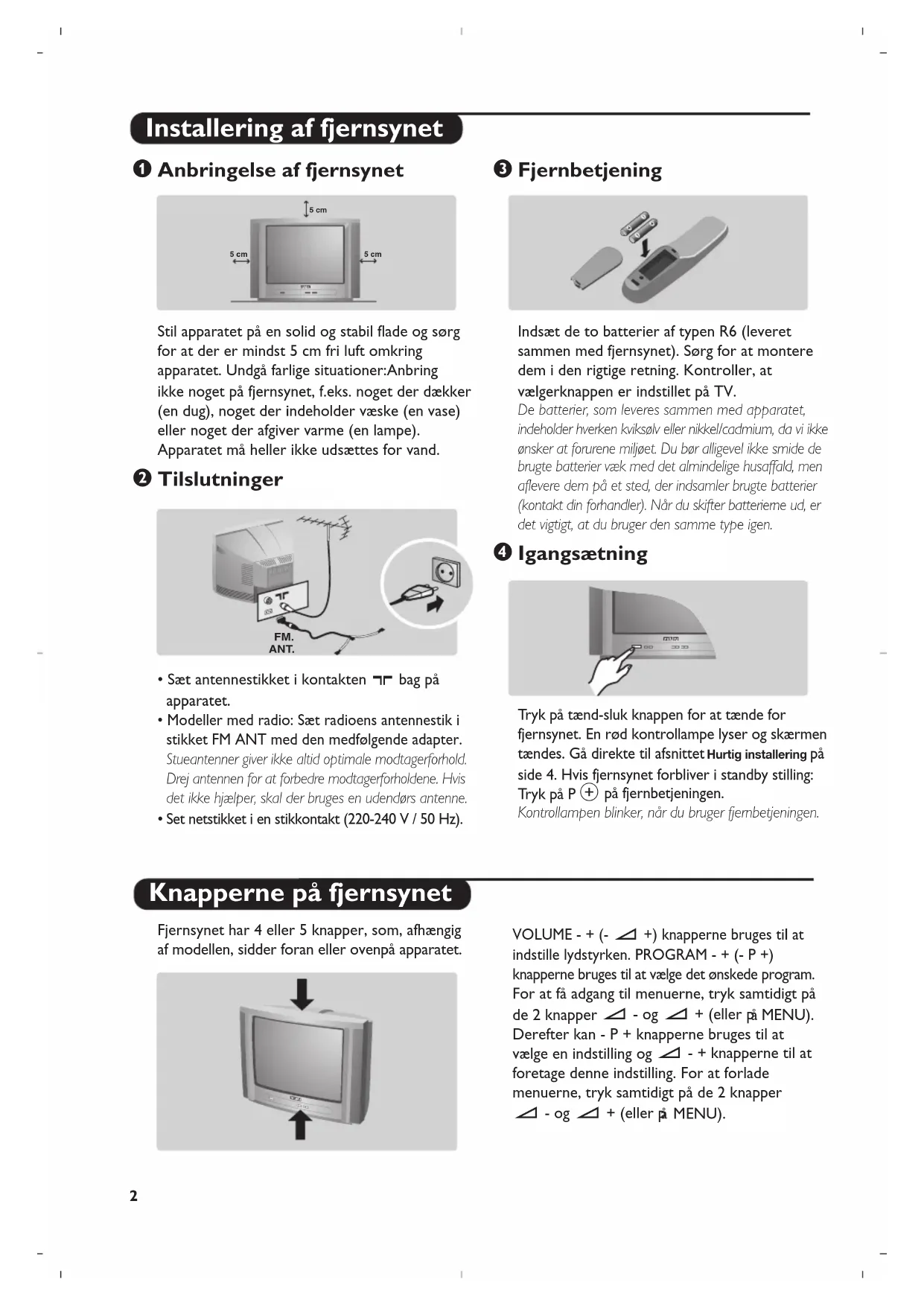Igangsætning Tr yk på tænd-sluk knappen for at tænde for fjernsynet. En rød kontrollampe lyser og skærmen tændes. Gå direkte til afsnittet Hurtig installering på side 4. Hvis fjernsynet forbliver i standby stilling: Tr yk på P # på fjernbetjeningen. Kontrollampen blinker, når du bruger fjernbetjeningen. Installering af fjernsynet Knapperne på fjernsynet 5 cm 5 cm 5 cm FM. ANT.3