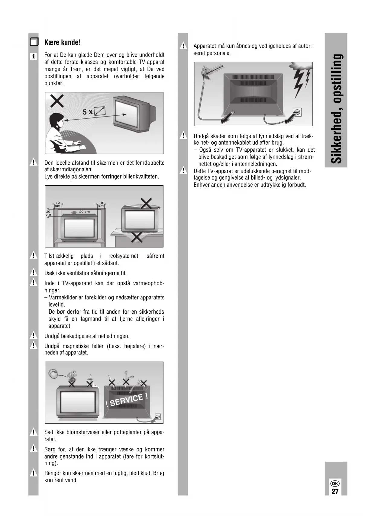 Dette TV-apparat er udelukkende beregnet til mod-tagelse og gengivelse af billed- og lydsignaler.Enhver anden anvendelse er udtrykkelig forbudt. Sikkerhed, opstilling