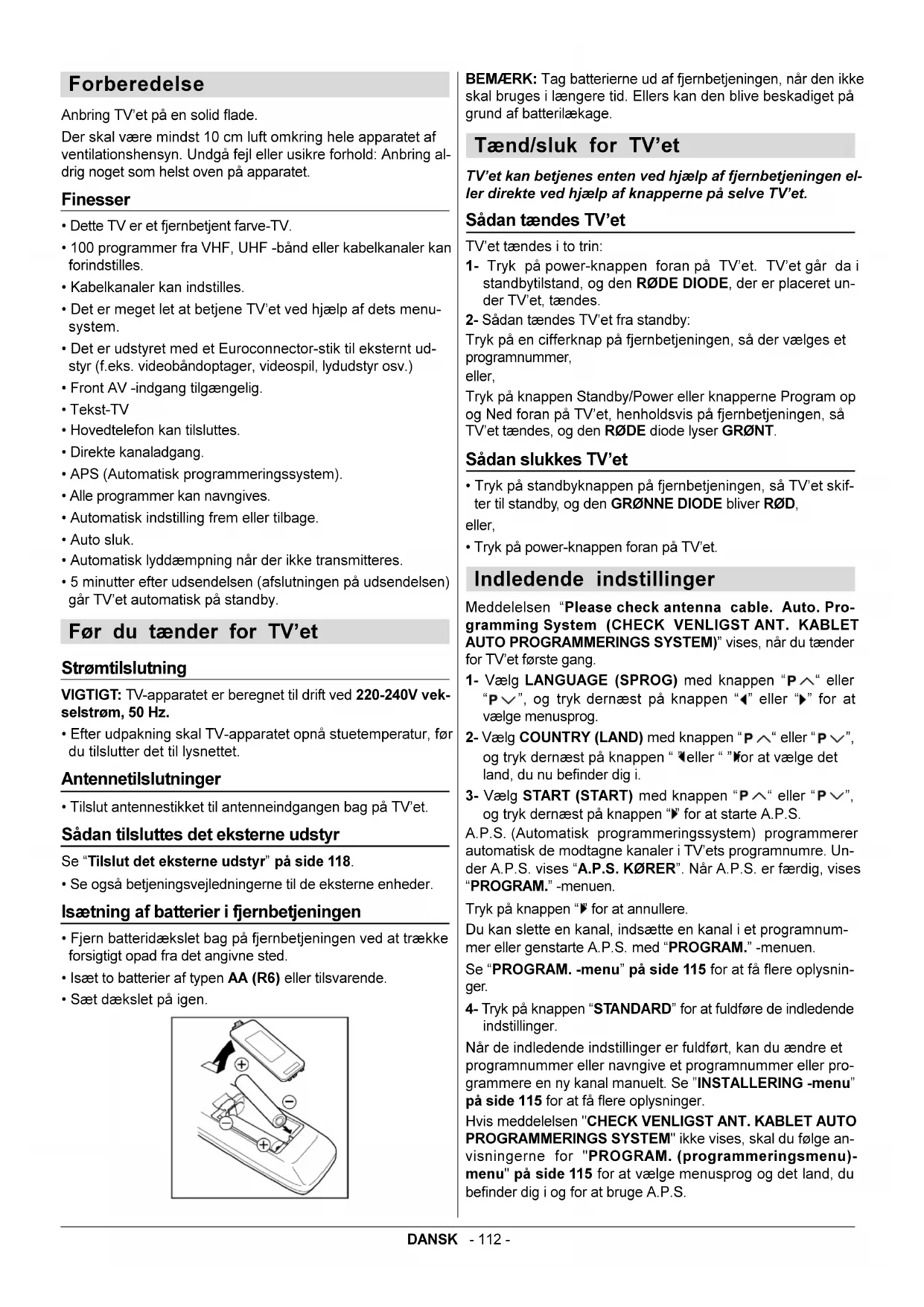 Lynet med pilesymbolet, inde i en ligesidet trekant, skal advare brugeren om tilstedeværelsen af uisoleret, farlig spænding inden for produktets indelukke, som kan være af tilstrækkelig størrelse til at udgøre en risiko for elektrisk stød for mennesker. Udråbstegnet inde i en ligesidet trekant skal advare brugeren om tilstedeværelsen af vigtige drifts- og vedligeholdel- ses- (service-) instruktioner i den dokumentation, der følger med apparatet.DANSK - 111 - Kontrolpanelets knapper Antennetilslutninger AV14BM8ENS AV14BJ8ENSDANSK - 112 - Forberedelse Anbring TVet på en solid flade. Der skal være mindst 10 cm luft omkring hele apparatet af ventilationshensyn. Undgå fejl eller usikre forhold: Anbring al- drig noget som helst oven på apparatet. Finesser Dette TV er et fjernbetjent farve-TV. 100 programmer fra VHF, UHF -bånd eller kabelkanaler kan forindstilles. Kabelkanaler kan indstilles. Det er meget let at betjene TVet ved hjælp af dets menu- system. Det er udstyret med et Euroconnector-stik til eksternt ud- styr (f.eks. videobåndoptager, videospil, lydudstyr osv.) Front AV -indgang tilgængelig. Tekst-TV Hovedtelefon kan tilsluttes. Direkte kanaladgang. APS (Automatisk programmeringssystem). Alle programmer kan navngives. Automatisk indstilling frem eller tilbage. Auto sluk. Automatisk lyddæmpning når der ikke transmitteres. 5 minutter efter udsendelsen (afslutningen på udsendelsen) går TVet automatisk på standby. Før du tænder for TVet Strømtilslutning VIGTIGT: TV-apparatet er beregnet til drift ved 220-240V vek- selstrøm, 50 Hz. Efter udpakning skal TV-apparatet opnå stuetemperatur, før du tilslutter det til lysnettet. Antennetilslutninger Tilslut antennestikket til antenneindgangen bag på TVet. Sådan tilsluttes det eksterne udstyr Se Tilslut det eksterne udstyr på side 118. Se også betjeningsvejledningerne til de eksterne enheder. Isætning af batterier i fjernbetjeningen Fjern batteridækslet bag på fjernbetjeningen ved at trække forsigtigt opad fra det angivne sted. Isæt to batterier af typen AA (R6) eller tilsvarende. Sæt dækslet på igen. BEMÆRK: Tag batterierne ud af fjernbetjeningen, når den ikke skal bruges i længere tid. Ellers kan den blive beskadiget på grund af batterilækage. Tænd/sluk for TVet TVet kan betjenes enten ved hjælp af fjernbetjeningen el- ler direkte ved hjælp af knapperne på selve TVet. Sådan tændes TVet TVet tændes i to trin: