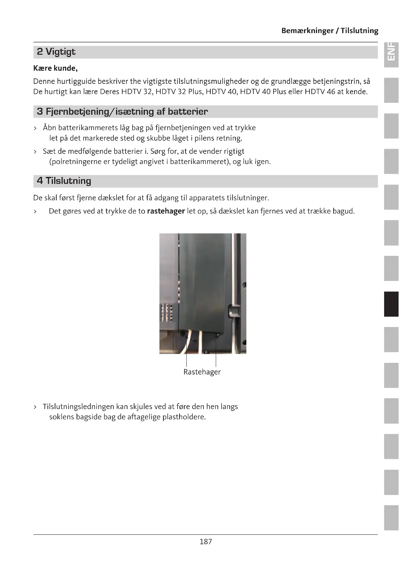 ENFRESITGRNLNODASVFIPLCZHURU Bemærkninger / Tilslutning 2 Vigtigt Kære kunde, Denne hurtigguide beskriver the vigtigste tilslutningsmuligheder og de grundlægge betjeningstrin, så De hurtigt kan lære Deres HDTV 32, HDTV 32 Plus, HDTV 40, HDTV 40 Plus eller HDTV 46 at kende. 3 Fjernbetjening/isætning af batterier > Åbn batterikammerets låg bag på fjernbetjeningen ved at trykke let på det markerede sted og skubbe låget i pilens retning. > Sæt de medfølgende batterier i. Sørg for, at de vender rigtigt (polretningerne er tydeligt angivet i batterikammeret), og luk igen. 4 Tilslutning De skal først fjerne dækslet for at få adgang til apparatets tilslutninger. > Det gøres ved at trykke de to rastehager let op, så dækslet kan fjernes ved at trække bagud. > Tilslutningsledningen kan skjules ved at føre den hen langs soklens bagside bag de aftagelige plastholdere. Rastehager188 Tilslutning