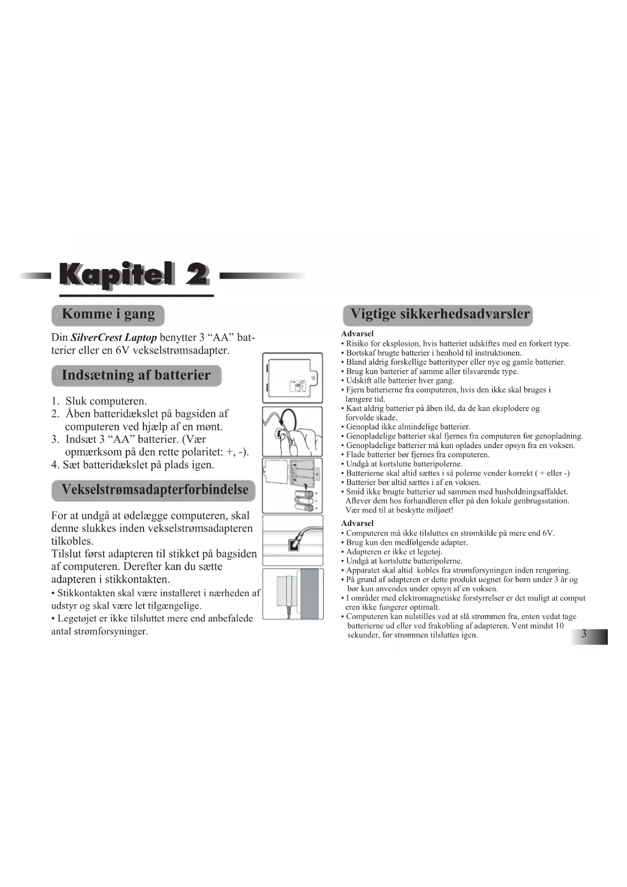 - Computeren kan nulstilles ved at slå strømmen fra, enten vedat tage batterierne ud eller ved frakobling af adapteren. Vent mindst 10 sekunder, før strømmen tilsluttes igen. Kapitel 2 Kapitel 24 ADVARSEL! Ikke egnet til børn under 3 år! Fare for kvælning, da små dele kan sluges. Fare for strangulering med muse- eller adapterledningerne! Hold børn væk fra plastikposer, da der er fare for kvælning! Læs denne vejledning nøje igennem inden produktet tages i brug. Behold denne brugsanvisning, da den indeholder vigtige oplysninger. Hvis produktet gives bort til andre, skal denne vejledning følge med. Forsøg aldrig at åbne dette produkt, der er ikke nogen af de indvendige dele, der kan serviceres af brugeren. Hvis der opstår problemer, skal man kontakte det lokale kundecenter. Auto-sluk For at spare på strømmen, vil computeren slukke automatisk, hvis den ikke bruges i et par minutter. Når du er klar til at lege igen, tændes computeren ved at trykke på DE FR EN tasten. Opbevaring og vedligehold Følg nedenstående, enkle trin for at sikre en lang levetid for produktet: