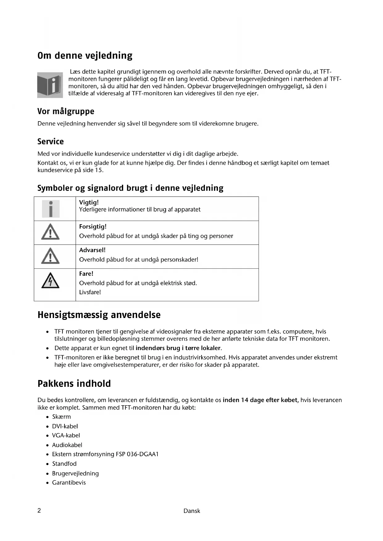 Om denne vejledning Læs dette kapitel grundigt igennem og overhold alle nævnte forskrifter. Derved opnår du, at TFT- monitoren fungerer pålideligt og får en lang levetid. Opbevar brugervejledningen i nærheden af TFT- monitoren, så du altid har den ved hånden. Opbevar brugervejledningen omhyggeligt, så den i tilfælde af videresalg af TFT-monitoren kan videregives til den nye ejer. Vor målgruppe Denne vejledning henvender sig såvel til begyndere som til viderekomne brugere. Service Med vor individuelle kundeservice understøtter vi dig i dit daglige arbejde. Kontakt os, vi er kun glade for at kunne hjælpe dig. Der findes i denne håndbog et særligt kapitel om temaet kundeservice på side 15. Symboler og signalord brugt i denne vejledning Vigtig! Yderligere informationer til brug af apparatet Forsigtig! Overhold påbud for at undgå skader på ting og personer Advarsel! Overhold påbud for at undgå personskader! Fare! Overhold påbud for at undgå elektrisk stød. Livsfare! Hensigtsmæssig anvendelse TFT monitoren tjener til gengivelse af videosignaler fra eksterne apparater som f.eks. computere, hvis tilslutninger og billedopløsning stemmer overens med de her anførte tekniske data for TFT monitoren. Dette apparat er kun egnet til indendørs brug i tørre lokaler. TFT-monitoren er ikke beregnet til brug i en industrivirksomhed. Hvis apparatet anvendes under ekstremt høje eller lave omgivelsestemperaturer, er der risiko for skader på apparatet. Pakkens indhold Du bedes kontrollere, om leverancen er fuldstændig, og kontakte os inden 14 dage efter købet, hvis leverancen ikke er komplet. Sammen med TFT-monitoren har du købt: Skærm DVI-kabel VGA-kabel Audiokabel Ekstern strømforsyning FSP 036-DGAA1 Standfod Brugervejledning GarantibevisSikkerhedsanvisninger