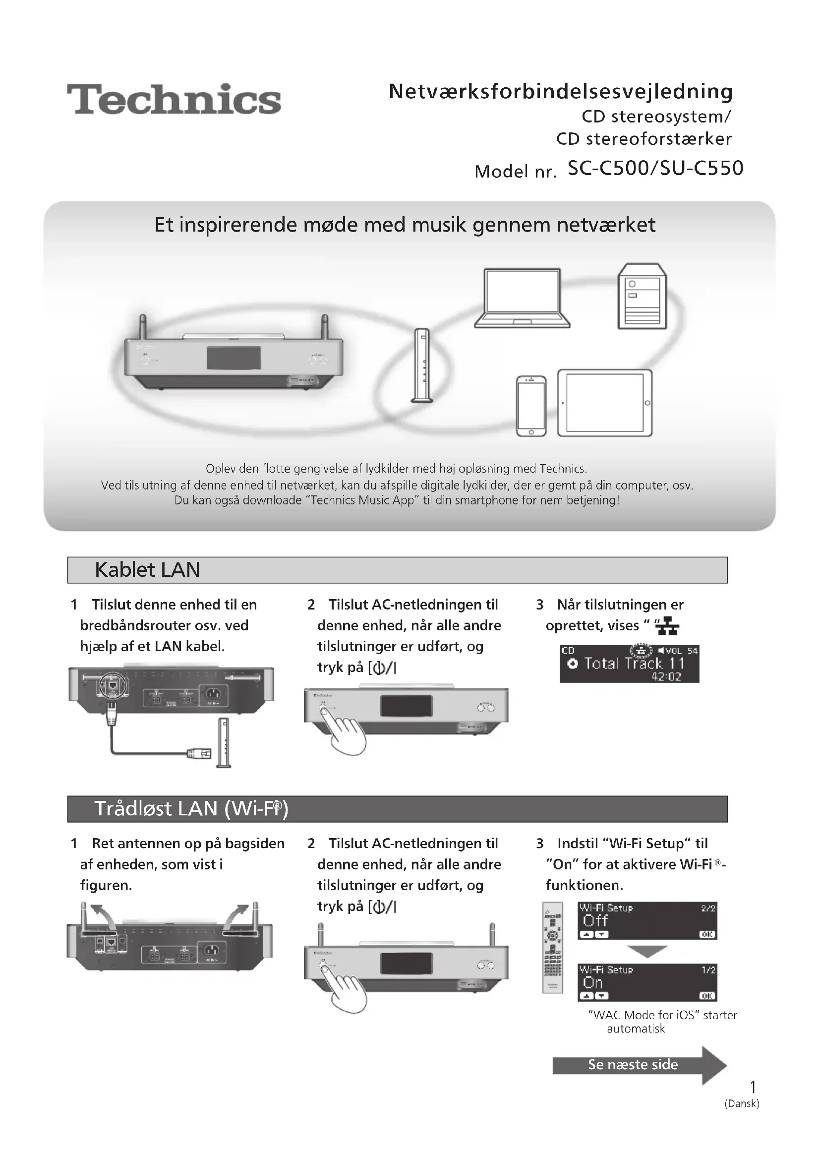 - Alla andra varumärken är varumärken som tillhör respektive ägare. (Svenska)1 Netværksforbindelsesvejledning CD stereosystem/ CD stereoforstærker Model nr. SC-C500/SU-C550 (Dansk) Et inspirerende møde med musik gennem netværket Oplev den flotte gengivelse af lydkilder med høj opløsning med Technics. Ved tilslutning af denne enhed til netværket, kan du afspille digitale lydkilder, der er gemt på din computer, osv. Du kan også downloade “Technics Music App” til din smartphone for nem betjening! Kablet LAN 1 Tilslut denne enhed til en bredbåndsrouter osv. ved hjælp af et LAN kabel. 2 Tilslut AC-netledningen til denne enhed, når alle andre tilslutninger er udført, og tryk på [ ]. 3 Når tilslutningen er oprettet, vises “ ”.