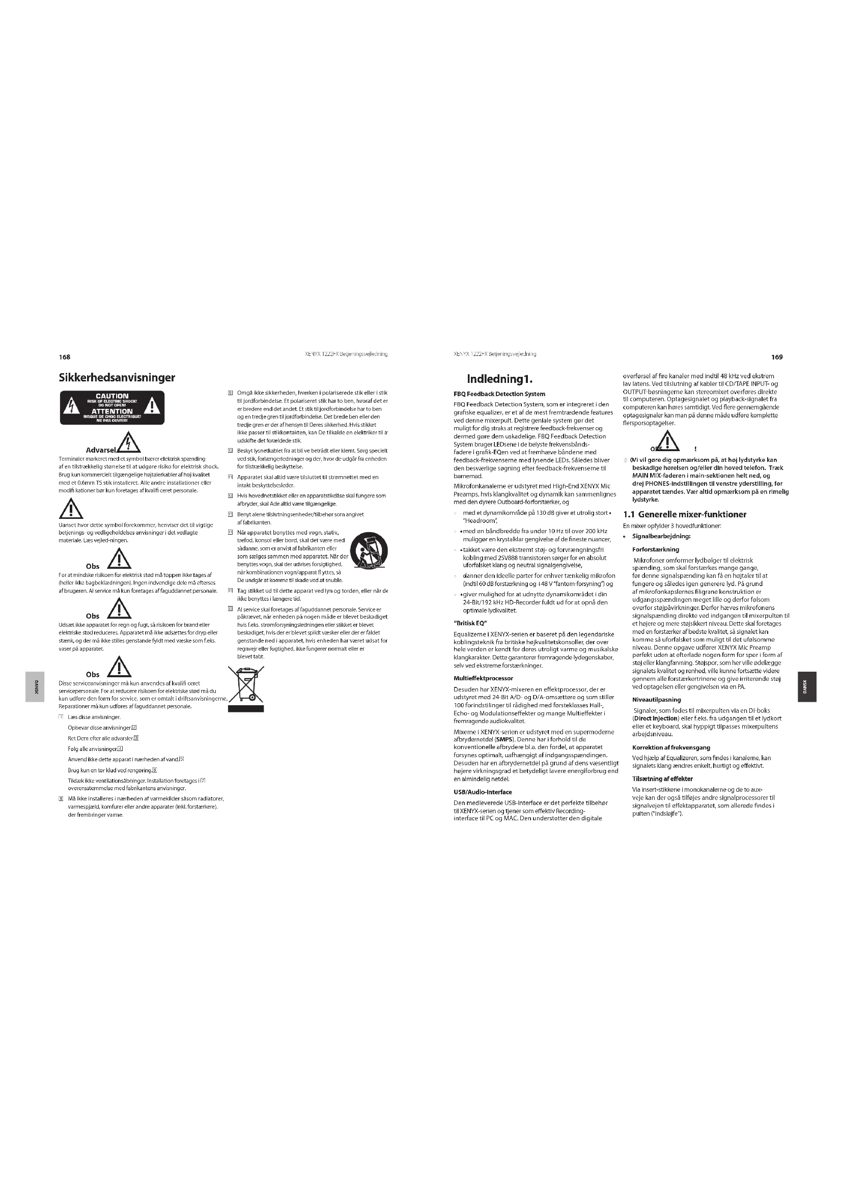DANSKXENYX 1222FX Betjeningsvejledning Advarsel* Terminaler markeret med et symbol bærer elektrisk spænding af en tilstrækkelig størrelse til at udgøre risiko for elektrisk shock. Brug kun kommercielt tilgængelige højtalerkabler af høj kvalitet med et 0,6mm TS stik installeret. Alle andre installationer eller modifi kationer bør kun foretages af kvalifi ceret personale. Uanset hvor dette symbol forekommer, henviser det til vigtige betjenings- og vedligeholdelses-anvisninger i det vedlagte materiale. Læs vejled-ningen. Obs ! For at mindske risikoen for elektrisk stød må toppen ikke tages af (heller ikke bagbeklædningen). Ingen indvendige dele må efterses af brugeren. Al service må kun foretages af faguddannet personale. Obs ! Udsæt ikke apparatet for regn og fugt, så risikoen for brand eller elektriske stød reduceres. Apparatet må ikke udsættes for dryp eller stænk, og der må ikke stilles genstande fyldt med væske som f.eks. vaser på apparatet. Obs ! Disse serviceanvisninger må kun anvendes af kvalifi ceret servicepersonale. For at reducere risikoen for elektriske stød må du kun udføre den form for service, som er omtalt i driftsanvisningerne. Reparationer må kun udføres af faguddannet personale.Læs disse anvisninger.[1] Opbevar disse anvisninger.[2] Ret Dem efter alle advarsler.[3] Følg alle anvisninger.[4] Anvend ikke dette apparat i nærheden af vand.[5] Brug kun en tør klud ved rengøring.[6] Tildæk ikke ventilationsåbninger. Installation foretages i [7] overensstemmelse med fabrikantens anvisninger.Må ikke installeres i nærheden af varmekilder såsom radiatorer, [8] varmespjæld, komfurer eller andre apparater (inkl. forstærkere). der frembringer varme.Omgå ikke sikkerheden, hverken i polariserede stik eller i stik [9] til jordforbindelse. Et polariseret stik har to ben, hvoraf det ene er bredere end det andet. Et stik til jordforbindelse har to ben og en tredje gren til jordforbindelse. Det brede ben eller den tredje gren er der af hensyn til Deres sikkerhed. Hvis stikket ikke passer til stikkontakten, kan De tilkalde en elektriker til at udskifte det forældede stik.Beskyt lysnetkablet fra at bli ve betrådt eller klemt. Sørg specielt {10} ved stik, forlængerledninger og der, hvor de udgår fra enheden for tilstrækkelig beskyttelse.Apparatet skal altid være tilsluttet til strømnettet med en {11} intakt beskyttelsesleder.Hvis hovednetstikket eller en apparatstikdåse skal fungere som {12} afbryder, skal Ade altid være tilgængelige.Benyt alene tilslutningsenheder/tilbehør som angivet {13} af fabrikanten.Når apparatet benyttes med vogn, stativ, {14} trefod, konsol eller bord, skal det være med sådanne, som er anvist af fabrikanten eller som sælges sammen med apparatet. Når der benyttes vogn, skal der udvises forsigtighed, når kombinationen vogn/apparat fl yttes, så De undgår at komme til skade ved at snuble. Tag stikket ud til dette apparat ved lyn og torden, eller når det {15} ikke benyttes i længere tid.Al service skal foretages af faguddannet personale. Service er {16} påkrævet, når enheden på nogen måde er blevet beskadiget, hvis f.eks. strømforsyningsledningen eller stikket er blevet beskadiget, hvis der er blevet spildt væsker eller der er faldet genstande ned i apparatet, hvis enheden har været udsat for regnvejr eller fugtighed, ikke fungerer normalt eller er blevet tabt.