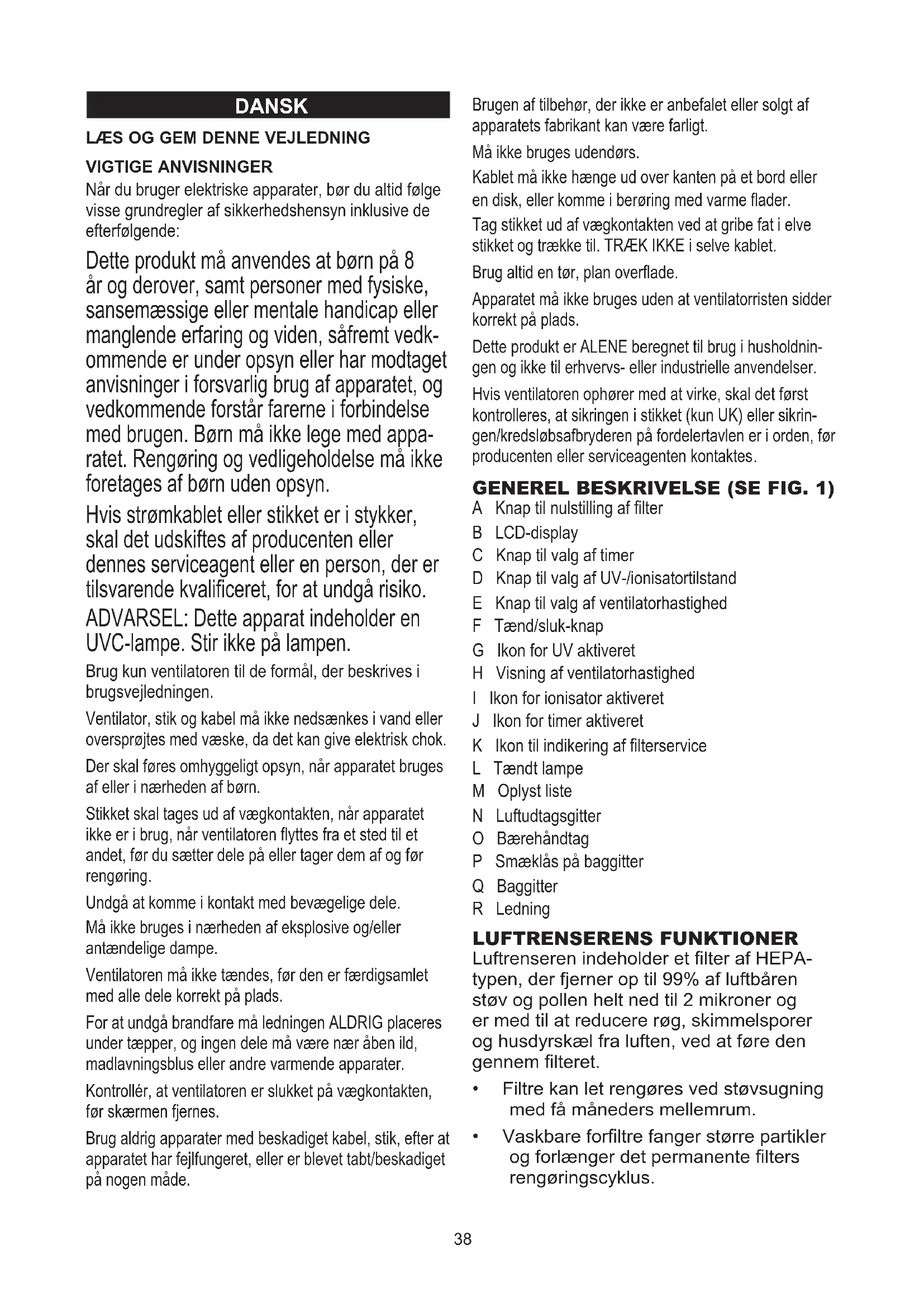 GENEREL BESKRIVELSE (SE FIG. 1) A Knap til nulstilling af lter B LCD-display C Knap til valg af timer D Knap til valg af UV-/ionisatortilstand E Knap til valg af ventilatorhastighed F Tænd/sluk-knap G Ikon for UV aktiveret H Visning af ventilatorhastighed I Ikon for ionisator aktiveret J Ikon for timer aktiveret K Ikon til indikering af lterservice L Tændt lampe M Oplyst liste N Luftudtagsgitter O Bærehåndtag P Smæklås på baggitter Q Baggitter R Ledning LUFTRENSERENS FUNKTIONER LuftrenserenindeholderetlterafHEPA- typen,derfjerneroptil99%afluftbåren støvogpollenheltnedtil2mikronerog ermedtilatreducererøg,skimmelsporer oghusdyrskælfraluften,vedatføreden gennemlteret.
