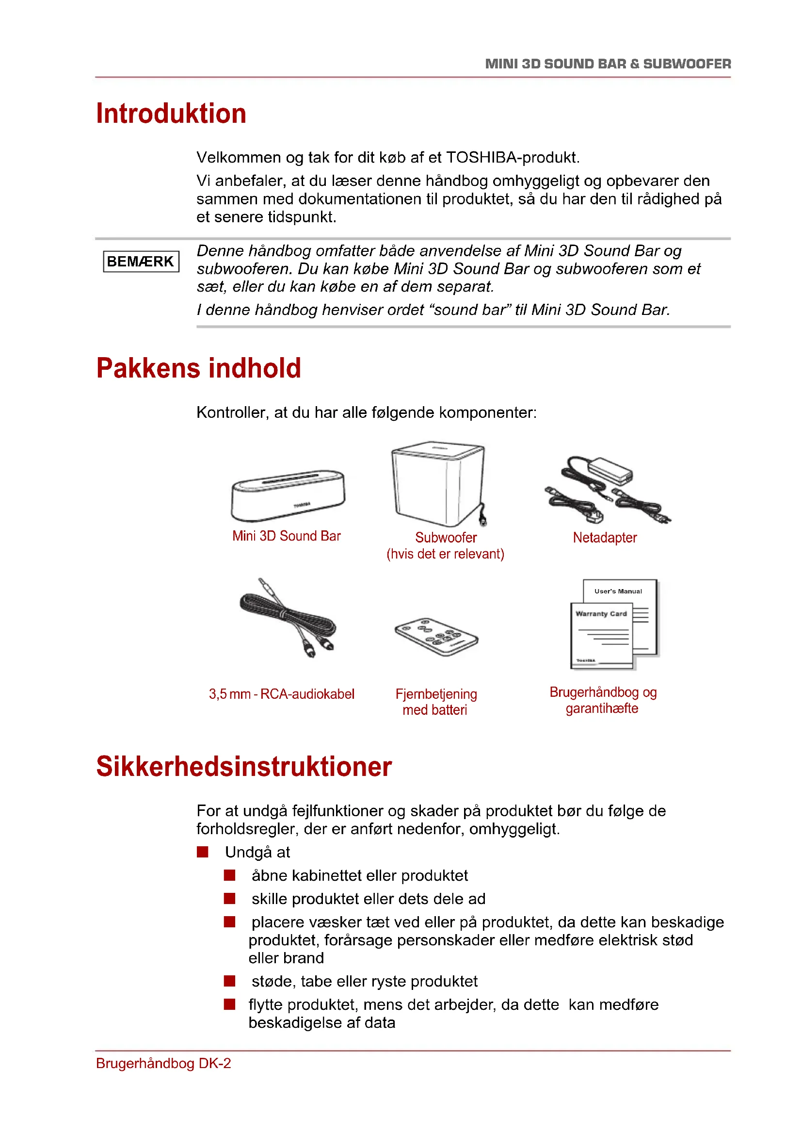 Introduktion Velkommen og tak for dit køb af et TOSHIBA-produkt. Vi anbefaler, at du læser denne håndbog omhyggeligt og opbevarer den sammen med dokumentationen til produktet, så du har den til rådighed på et senere tidspunkt. Pakkens indhold Kontroller, at du har alle følgende komponenter: Sikkerhedsinstruktioner For at undgå fejlfunktioner og skader på produktet bør du følge de forholdsregler, der er anført nedenfor, omhyggeligt. ■ Undgå at ■ åbne kabinettet eller produktet ■ skille produktet eller dets dele ad ■ placere væsker tæt ved eller på produktet, da dette kan beskadige produktet, forårsage personskader eller medføre elektrisk stød eller brand ■ støde, tabe eller ryste produktet ■ flytte produktet, mens det arbejder, da dette kan medføre beskadigelse af data Denne håndbog omfatter både anvendelse af Mini 3D Sound Bar og subwooferen. Du kan købe Mini 3D Sound Bar og subwooferen som et sæt, eller du kan købe en af dem separat. I denne håndbog henviser ordet “sound bar” til Mini 3D Sound Bar. BEMÆRK User’s Manual Mini 3D Sound Bar Subwoofer (hvis det er relevant) Netadapter 3,5 mm - RCA-audiokabel Fjernbetjening med batteri Brugerhåndbog og garantihæfteDK-3 Brugerhåndbog