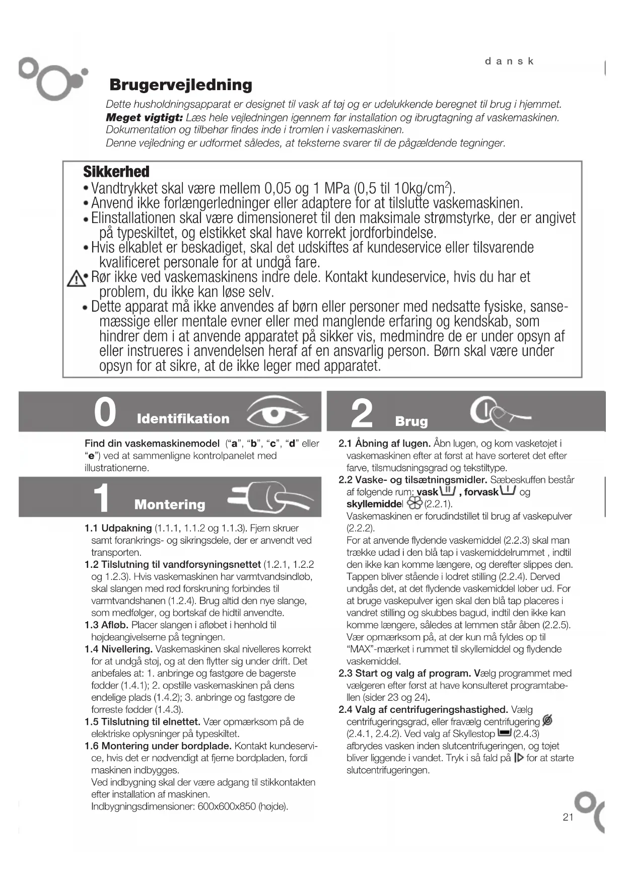 Anvend ikke forlængerledninger eller adaptere for at tilslutte vaskemaskinen. Elinstallationen skal være dimensioneret til den maksimale strømstyrke, der er angivet på typeskiltet, og elstikket skal have korrekt jordforbindelse. Hvis elkablet er beskadiget, skal det udskiftes af kundeservice eller tilsvarende kvalificeret personale for at undgå fare. Rør ikke ved vaskemaskinens indre dele. Kontakt kundeservice, hvis du har et problem, du ikke kan løse selv. Dette apparat må ikke anvendes af børn eller personer med nedsatte fysiske, sanse- mæssige eller mentale evner eller med manglende erfaring og kendskab, som hindrer dem i at anvende apparatet på sikker vis, medmindre de er under opsyn af eller instrueres i anvendelsen heraf af en ansvarlig person. Børn skal være under opsyn for at sikre, at de ikke leger med apparatet. Find din vaskemaskinemodel (“a”, “b”, “c”, “d” eller “e”) ved at sammenligne kontrolpanelet med illustrationerne.1.1 Udpakning (1.1.1, 1.1.2 og 1.1.3). Fjern skruer samt forankrings- og sikringsdele, der er anvendt ved transporten.1.2 Tilslutning til vandforsyningsnettet (1.2.1, 1.2.2 og 1.2.3). Hvis vaskemaskinen har varmtvandsindløb, skal slangen med rød forskruning forbindes til varmtvandshanen (1.2.4). Brug altid den nye slange, som medfølger, og bortskaf de hidtil anvendte.1.3 Afløb. Placer slangen i afløbet i henhold til højdeangivelserne på tegningen.1.4 Nivellering. Vaskemaskinen skal nivelleres korrekt for at undgå støj, og at den flytter sig under drift. Det anbefales at: 1. anbringe og fastgøre de bagerste fødder (1.4.1); 2. opstille vaskemaskinen på dens endelige plads (1.4.2); 3. anbringe og fastgøre de forreste fødder (1.4.3).1.5 Tilslutning til elnettet. Vær opmærksom på de elektriske oplysninger på typeskiltet.1.6 Montering under bordplade. Kontakt kundeservi-ce, hvis det er nødvendigt at fjerne bordpladen, fordi maskinen indbygges.Ved indbygning skal der være adgang til stikkontakten efter installation af maskinen.Indbygningsdimensioner: 600x600x850 (højde).2.1 Åbning af lugen. Åbn lugen, og kom vasketøjet i vaskemaskinen efter at først at have sorteret det efter farve, tilsmudsningsgrad og tekstiltype. 2.2 Vaske- og tilsætningsmidler. Sæbeskuffen består af følgende rum: vask , forvask og skyllemiddel (2.2.1). Vaskemaskinen er forudindstillet til brug af vaskepulver (2.2.2).For at anvende flydende vaskemiddel (2.2.3) skal man trække udad i den blå tap i vaskemiddelrummet , indtil den ikke kan komme længere, og derefter slippes den. Tappen bliver stående i lodret stilling (2.2.4). Derved undgås det, at det flydende vaskemiddel løber ud. For at bruge vaskepulver igen skal den blå tap placeres i vandret stilling og skubbes bagud, indtil den ikke kan komme længere, således at lemmen står åben (2.2.5).Vær opmærksom på, at der kun må fyldes op til “MAX”-mærket i rummet til skyllemiddel og flydende vaskemiddel. 2.3 Start og valg af program. Vælg programmet med vælgeren efter først at have konsulteret programtabe-llen (sider 23 og 24). 2.4 Valg af centrifugeringshastighed. Vælg centrifugeringsgrad, eller fravælg centrifugering (2.4.1, 2.4.2). Ved valg af Skyllestop (2.4.3) afbrydes vasken inden slutcentrifugeringen, og tøjet bliver liggende i vandet. Tryk i så fald på for at starte slutcentrifugeringen. Sikkerhed Montering22 dansk