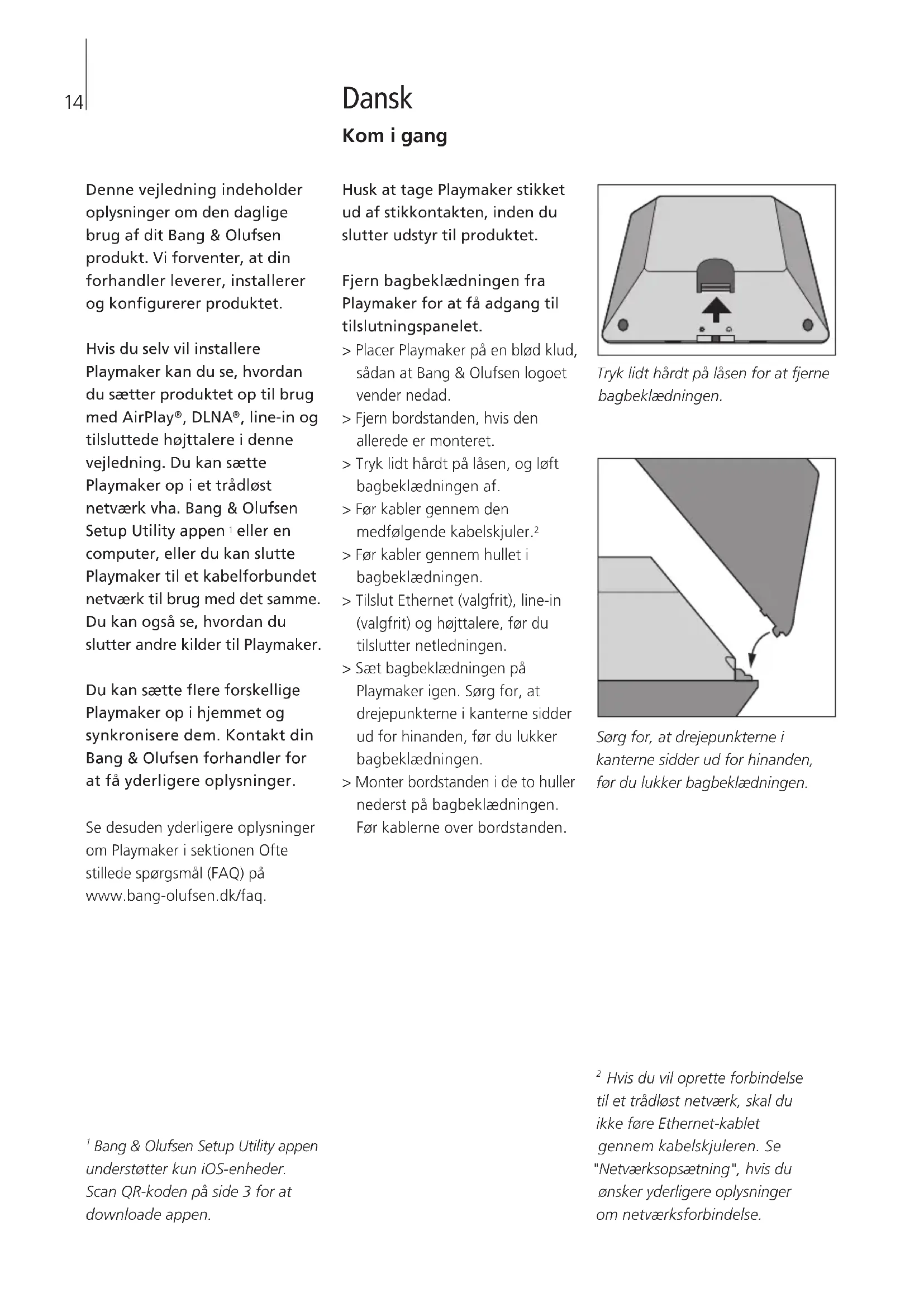 eller en computer, eller du kan slutte Playmaker til et kabelforbundet netværk til brug med det samme. Du kan også se, hvordan du slutter andre kilder til Playmaker. Du kan sætte ere forskellige Playmaker op i hjemmet og synkronisere dem. Kontakt din Bang& Olufsen forhandler for at få yderligere oplysninger. Se desuden yderligere oplysninger om Playmaker i sektionen Ofte stillede spørgsmål (FAQ) på www.bang-olufsen.dk/faq. Husk at tage Playmaker stikket ud af stikkontakten, inden du slutter udstyr til produktet. Fjern bagbeklædningen fra Playmaker for at få adgang til tilslutningspanelet. > Placer Playmaker på en blød klud, sådan at Bang& Olufsen logoet vender nedad. > Fjern bordstanden, hvis den allerede er monteret. > Tryk lidt hårdt på låsen, og løft bagbeklædningen af. > Før kabler gennem den medfølgende kabelskjuler.